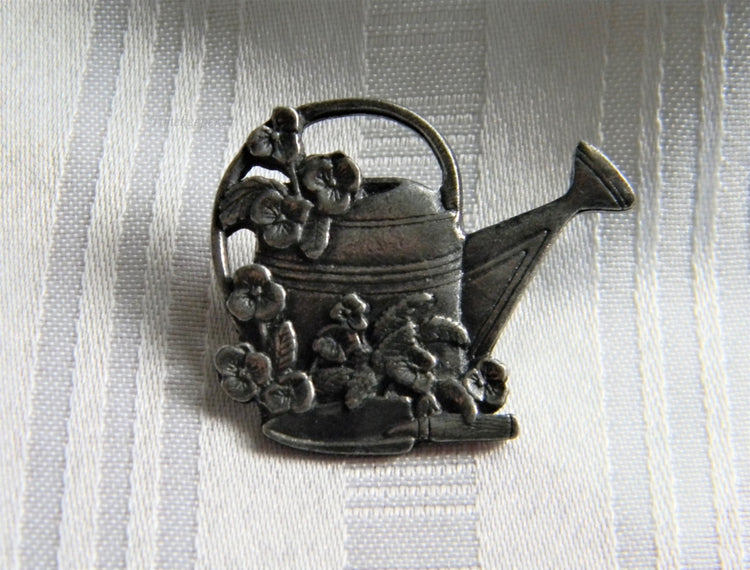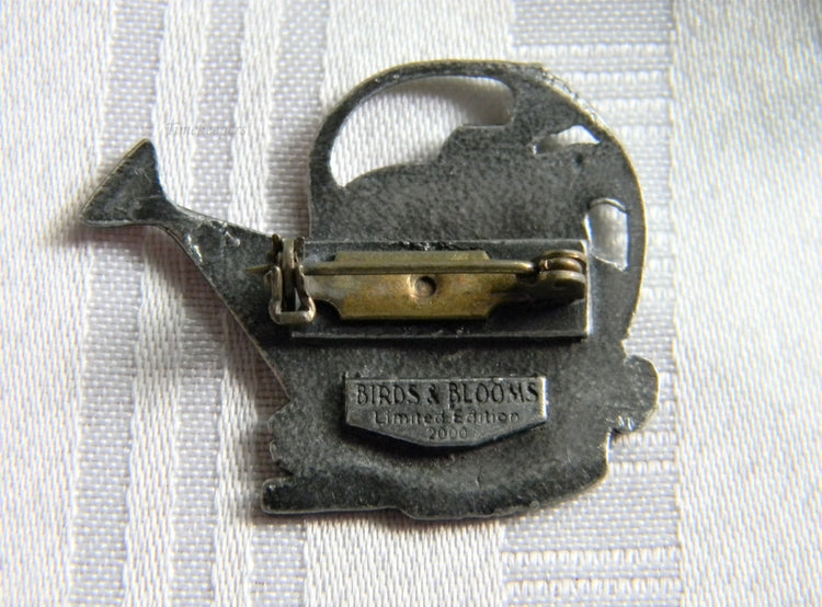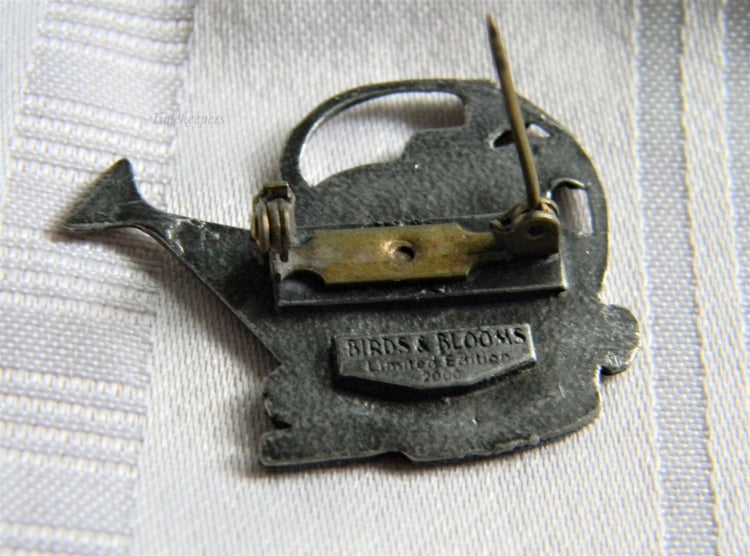 Cute Birds and Blooms Limited edition 2000 brooch featuring a watering can and flowers. This brooch is marked o the back. Everything works as it should.