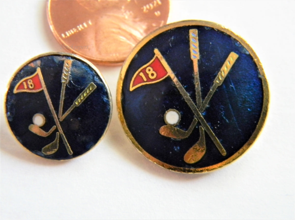 Two sets of nice golfing buttons. One set features an enamel design with golf clubs, golf balls, and 18th hole flag on (3) large buttons and (2) small buttons. These buttons do show some wear. Please verify the condition with the pictures. The other set is (4) gold tone buttons with a golf ball in the middle and crossed golf clubs. Two of these gold tone buttons are marked Ben Silver on the back. Please look at the photos to verify condition.