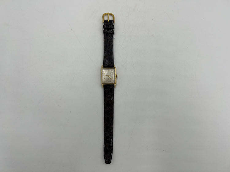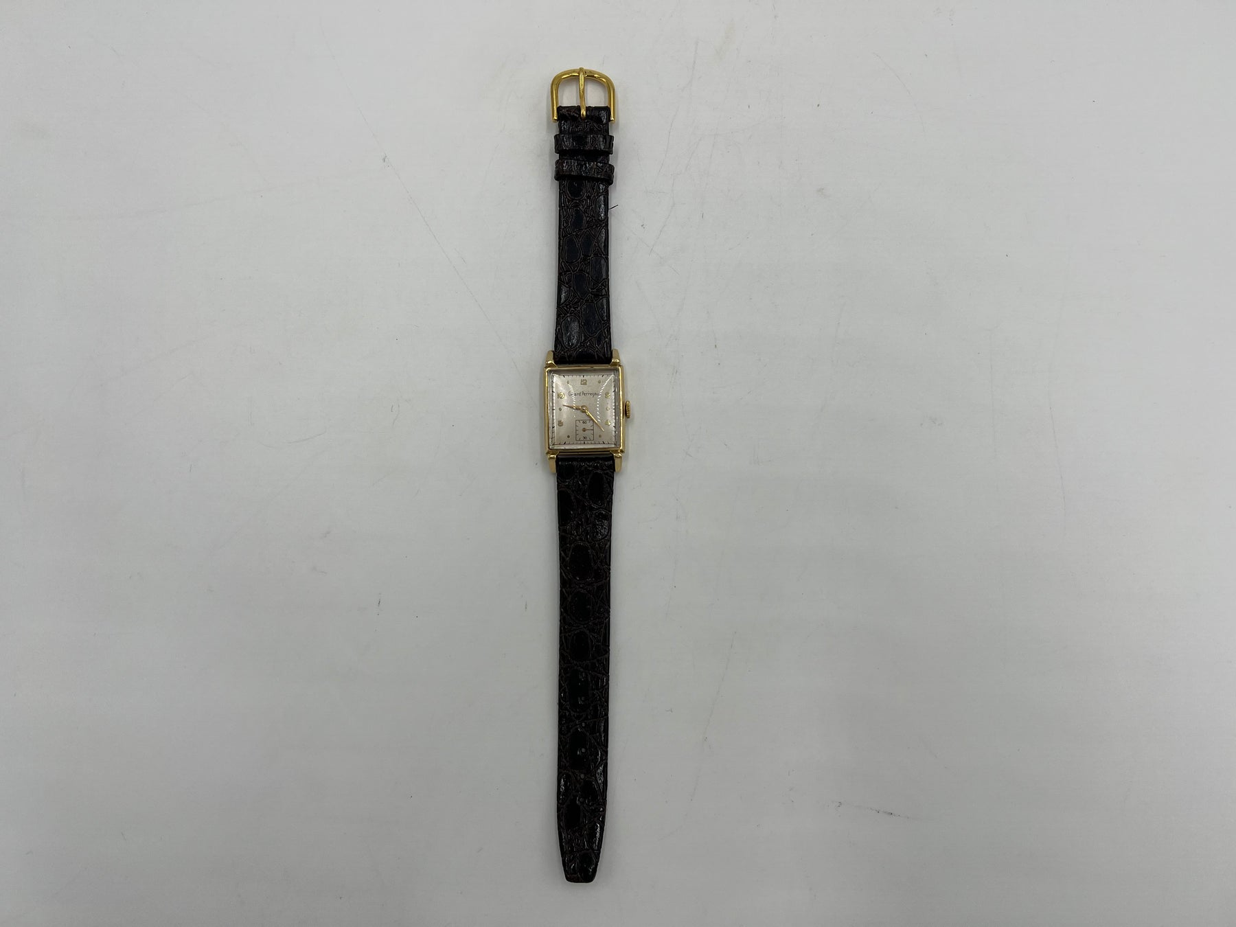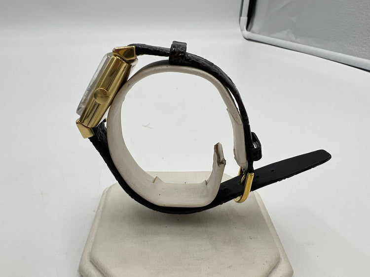 This is a handsome Girarard Perregeaux in 14k yellow gold featuring a striking black leather band.