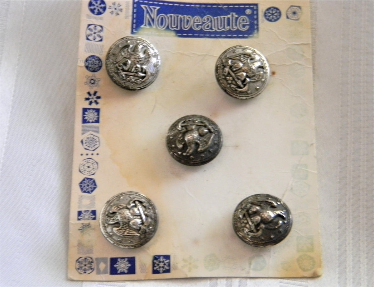 p209 Set of (5) Vintage Nouveaute Eagle Buttons on Original Card in Silver Tone