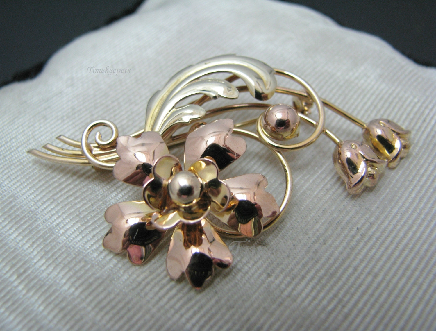 a678 Vintage Tri-Color Flower Brooch in 10k Yellow, Rose, & Green Gold