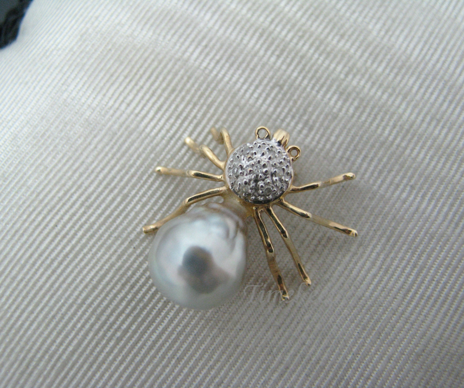 a578 Stunning Vintage 14k Yellow Gold Spider Brooch Pin Pearl Body Diamond Head