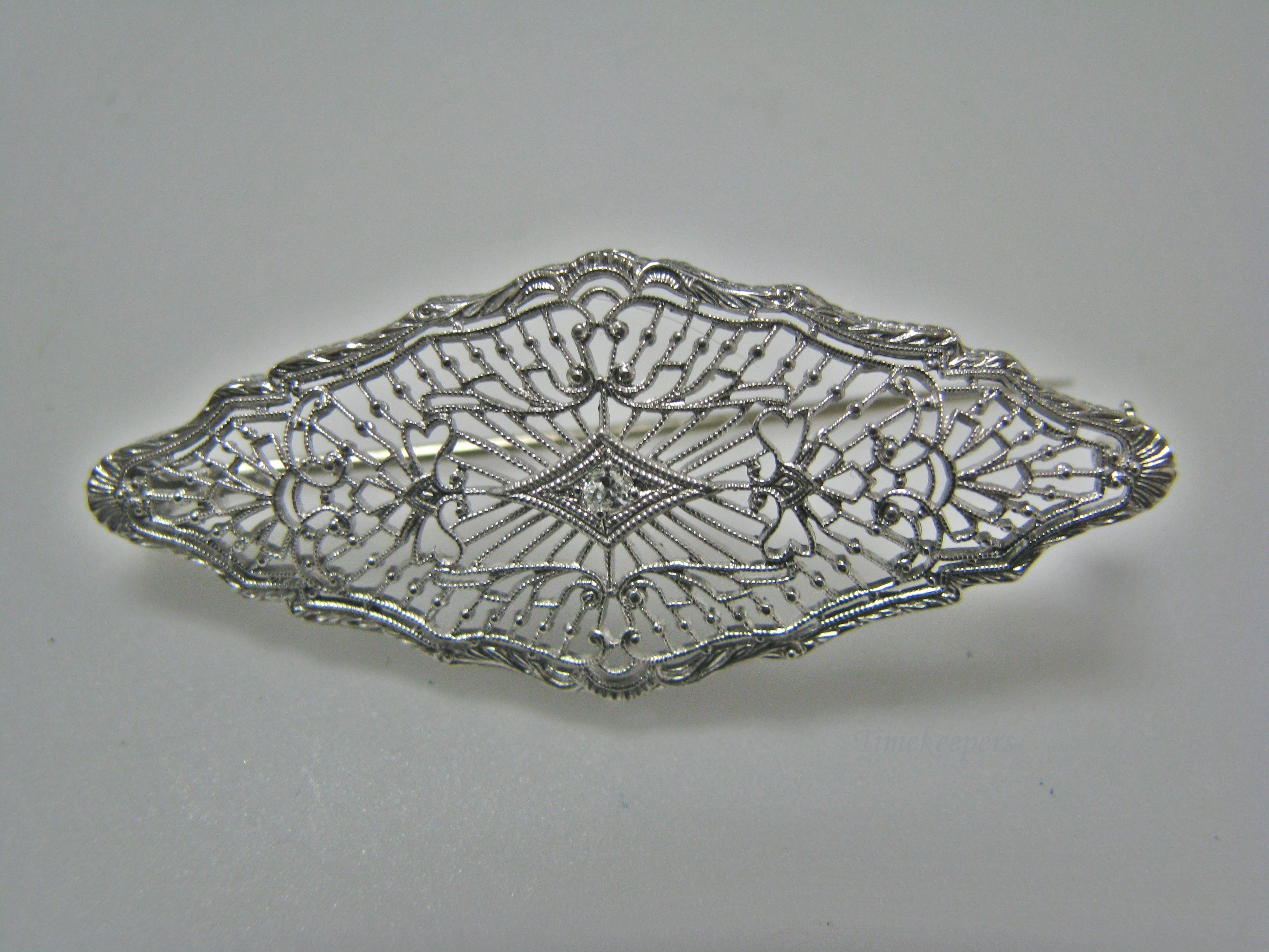 H142 Gorgeous 14k White Gold Filigree Pin / Brooch with Diamond in the Center