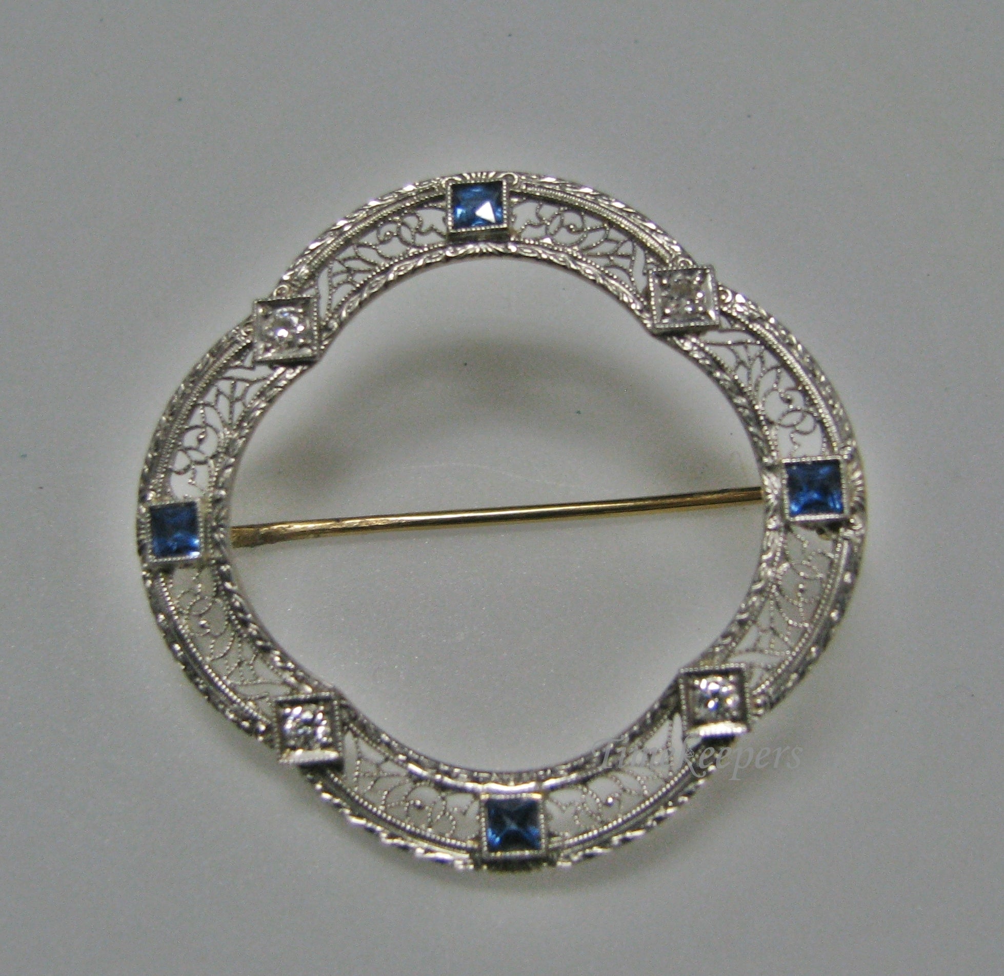 H143 Stunning 14k WGold and YGold Filigree Pin/ Brooch with Sapphire and Diamond