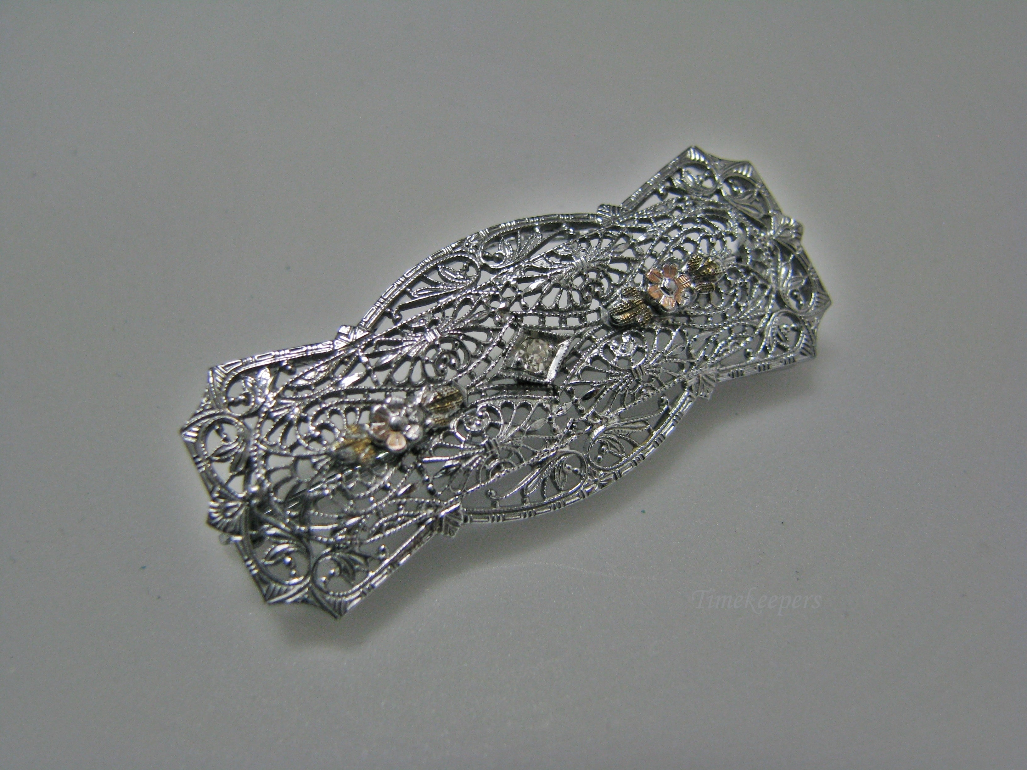 H158 Stunning 10k White Gold Filigree Pin / Brooch with Diamond in the Center