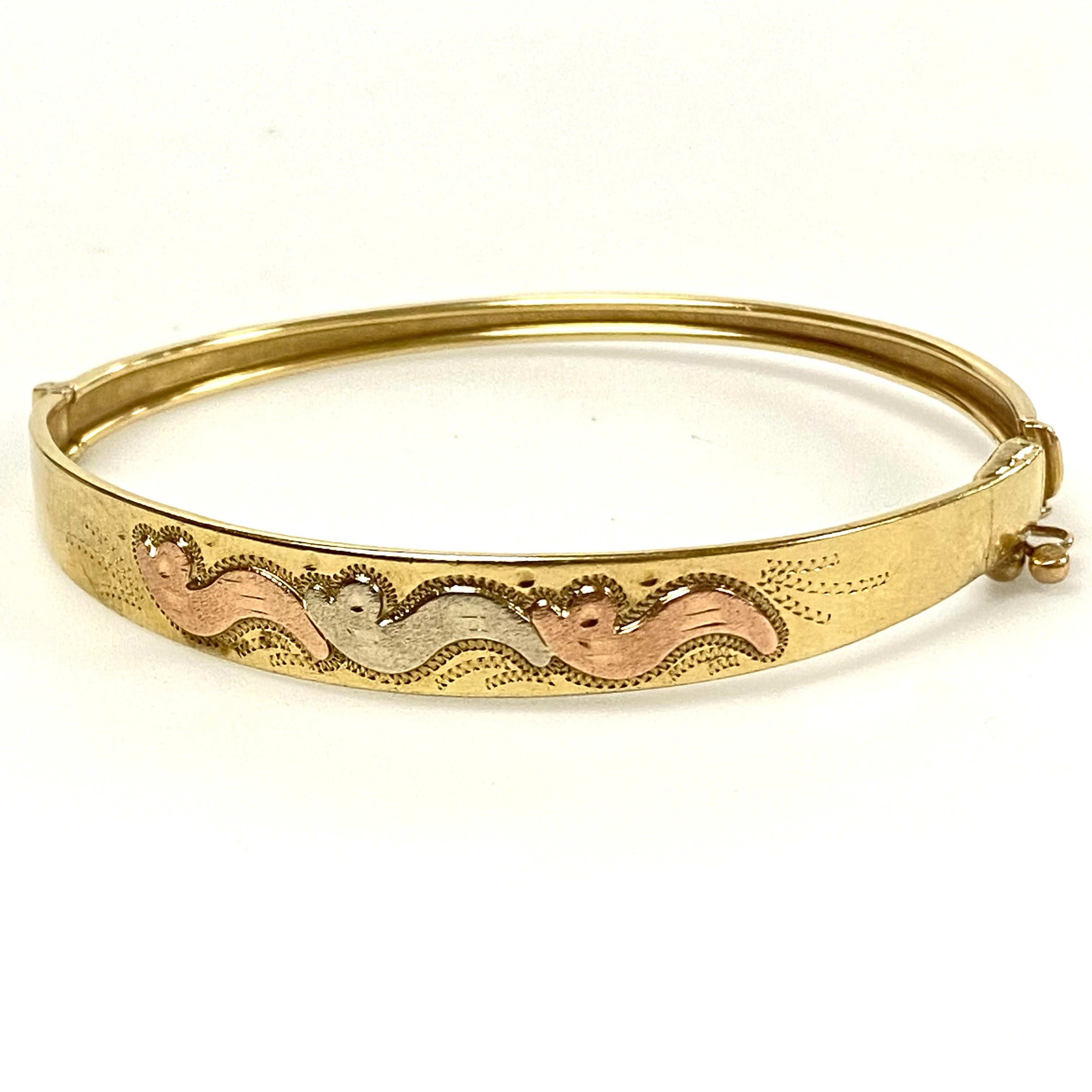 v230 Vintage 10K Yellow White Rose 3-Color Gold Hinged Unisex Bracelet 7" long
