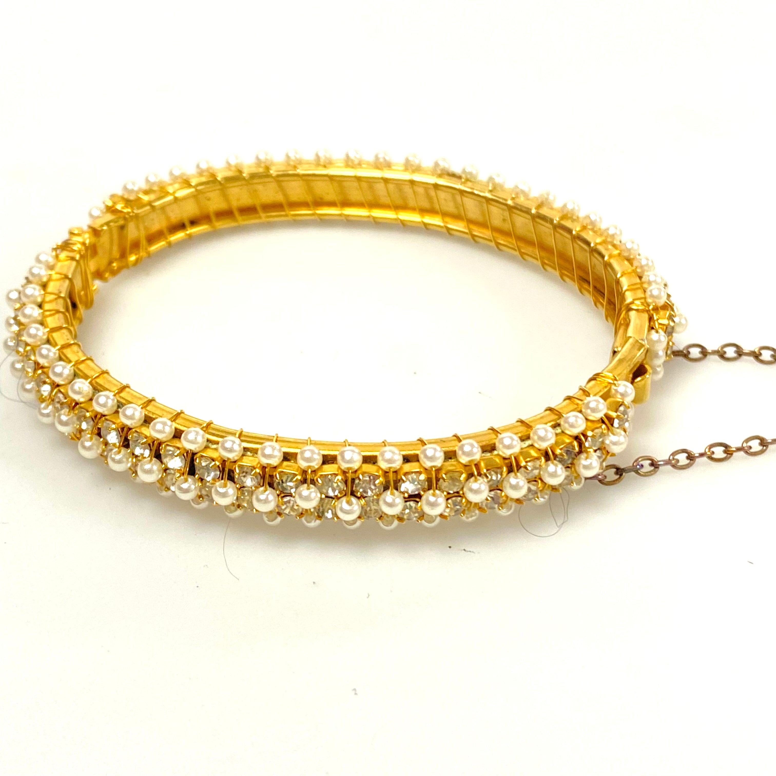 v231 Vintage Gold Tone Pearl Beaded White Stones Unisex Bangle Bracelet 8" long