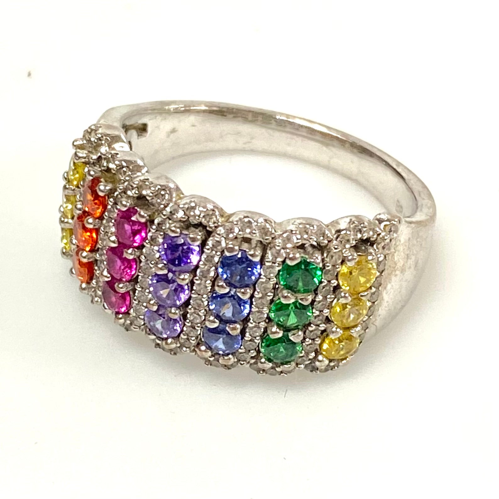 v578 Vintage 11mm Sterling Silver Band with Rainbow Color Gemstones Ring Size 10