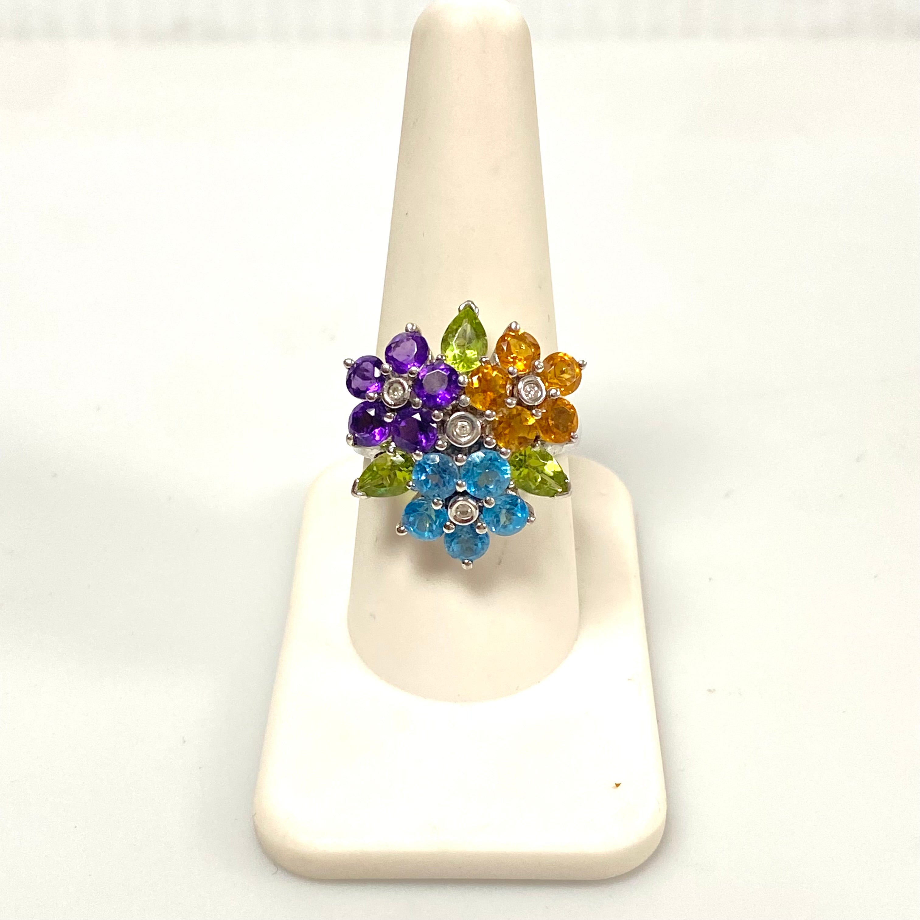 v579 Vintage 14K Gold Sterling Silver Multi Gemstones Flower Cluster Ring Size 9