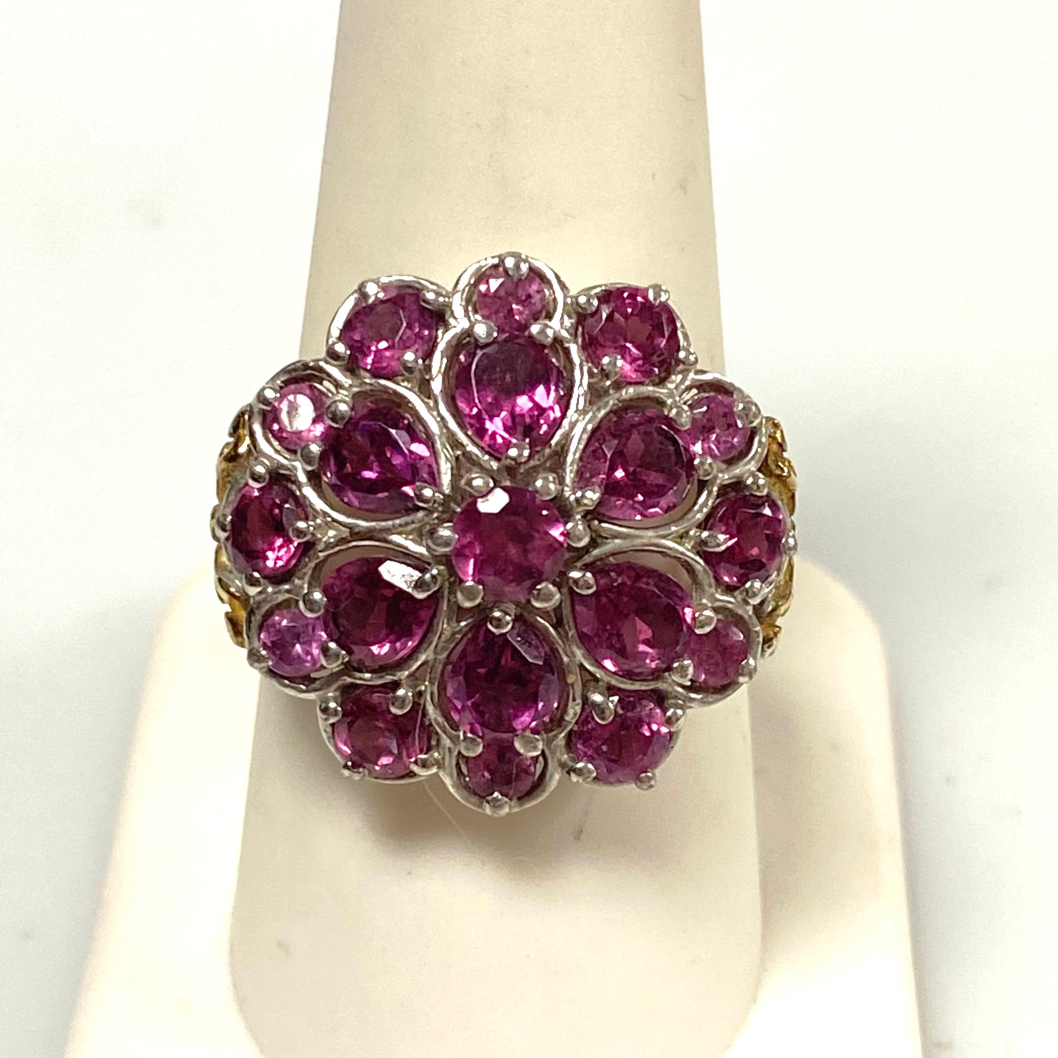 v580 Vintage Sterling Silver Pink Gemstone Cluster Ring with Gold accents on the shank Size 9