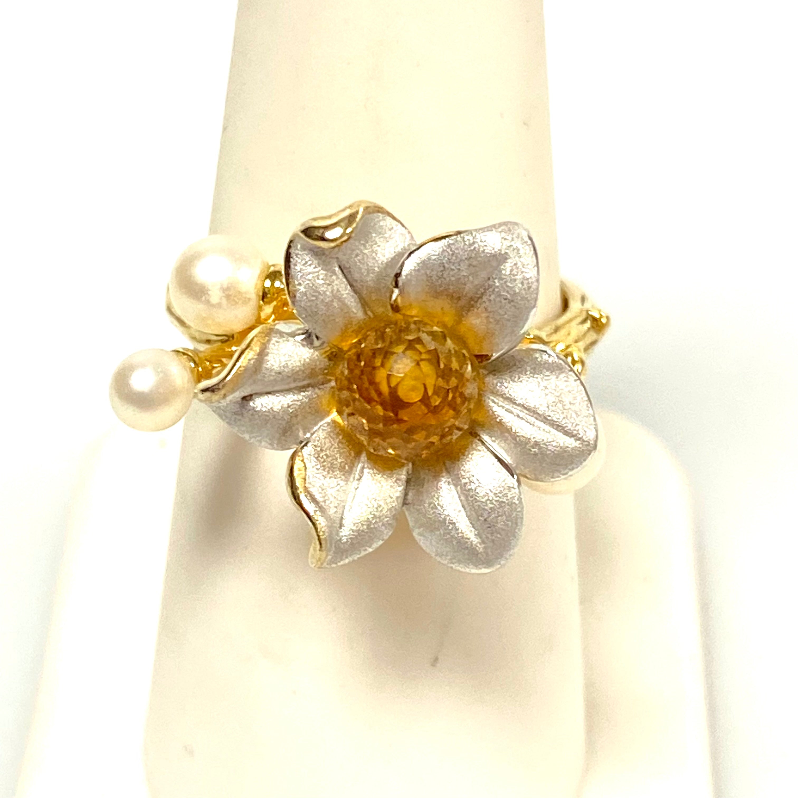 v581 Vintage Sterling Silver Flower Ring Fresh Water Pearls & Citrine Size 7.75