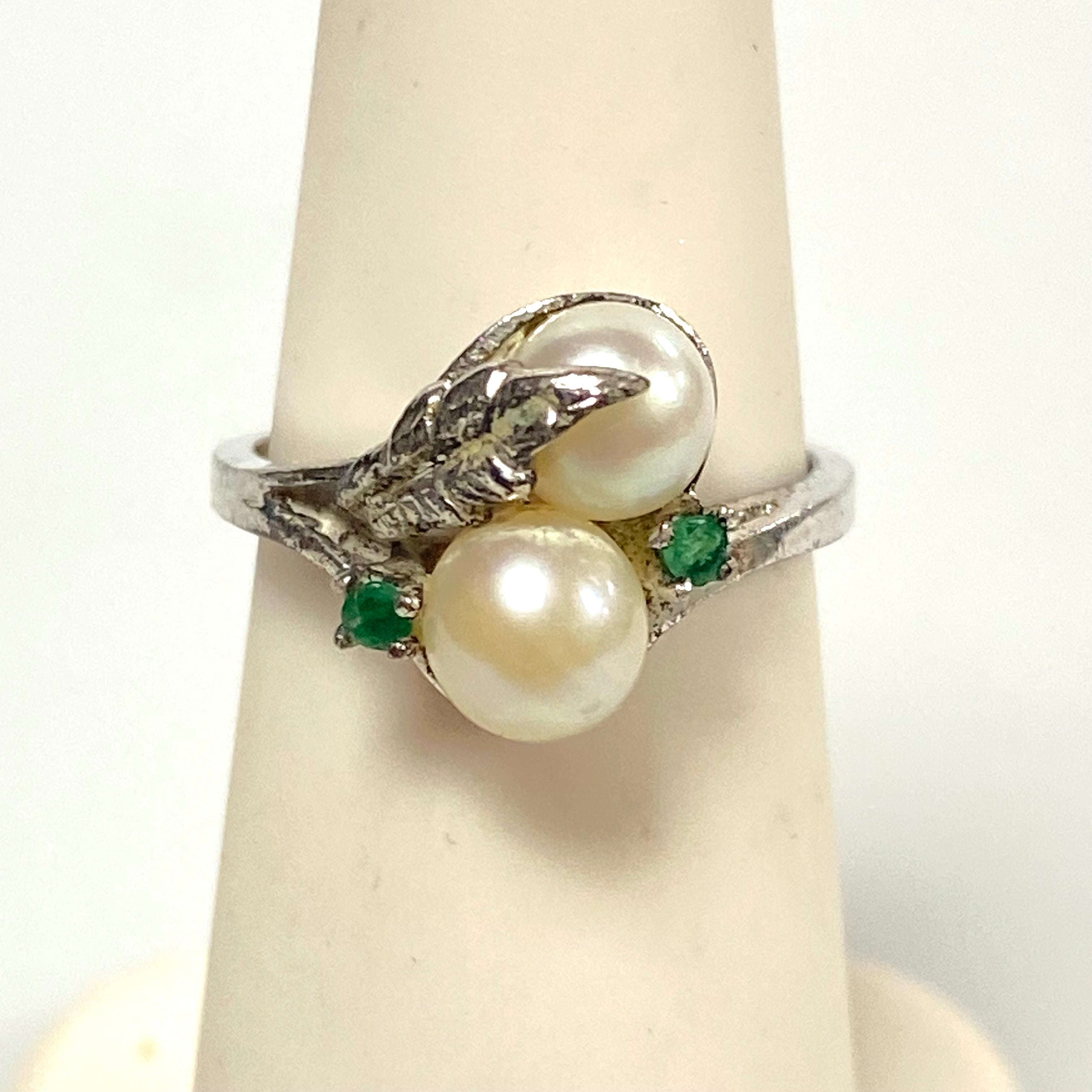 v583 Vintage Sterling Silver Pearl and Emerald "Toi et Moi" Style Ring Size 4.75