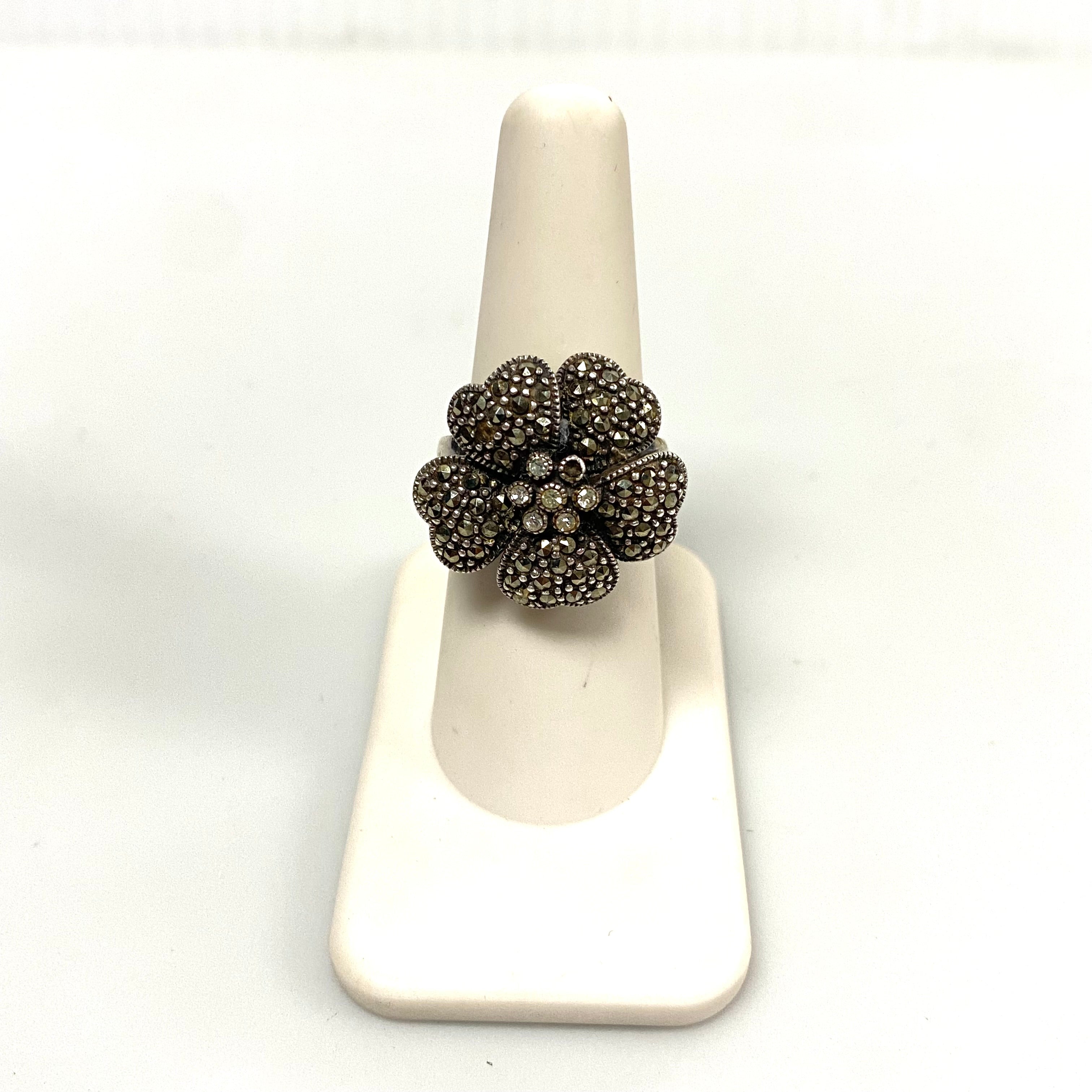 v584 Vintage Sterling Silver 925 Marcasite & Cubic Zirconia Flower Ring Size 7.5