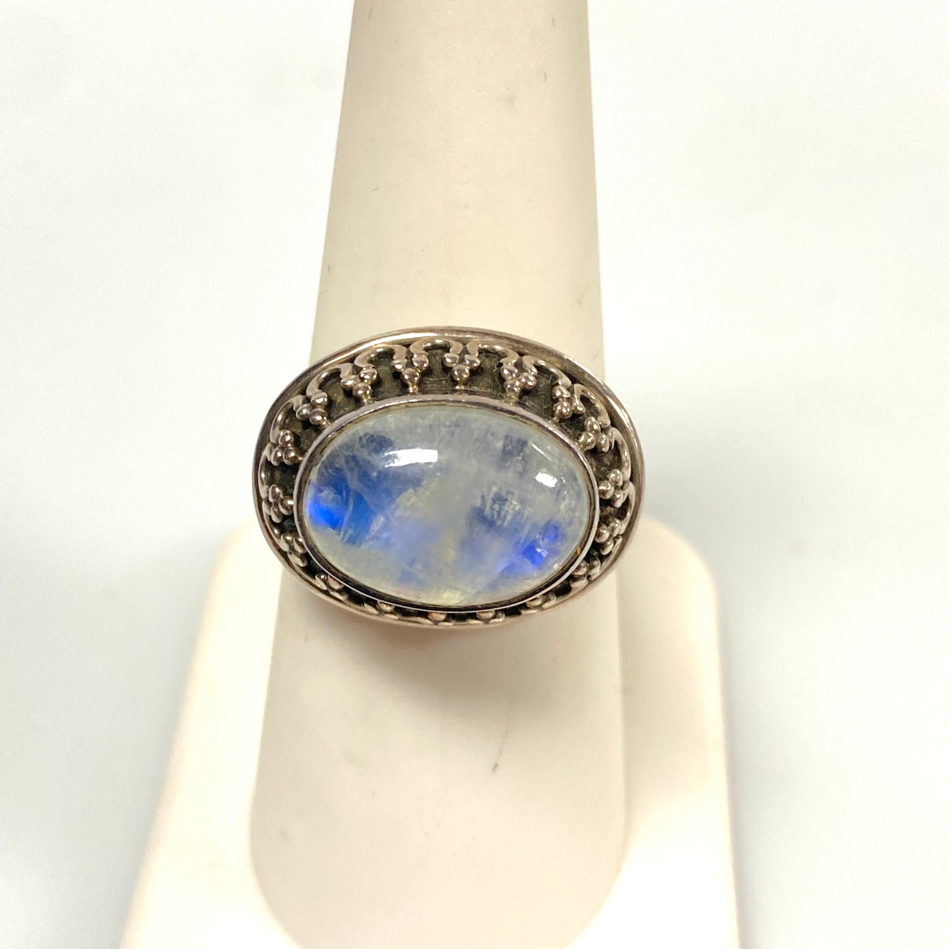v585 Vintage Moonstone Cabochon Ring in Sterling Silver Filigree Setting Size 8