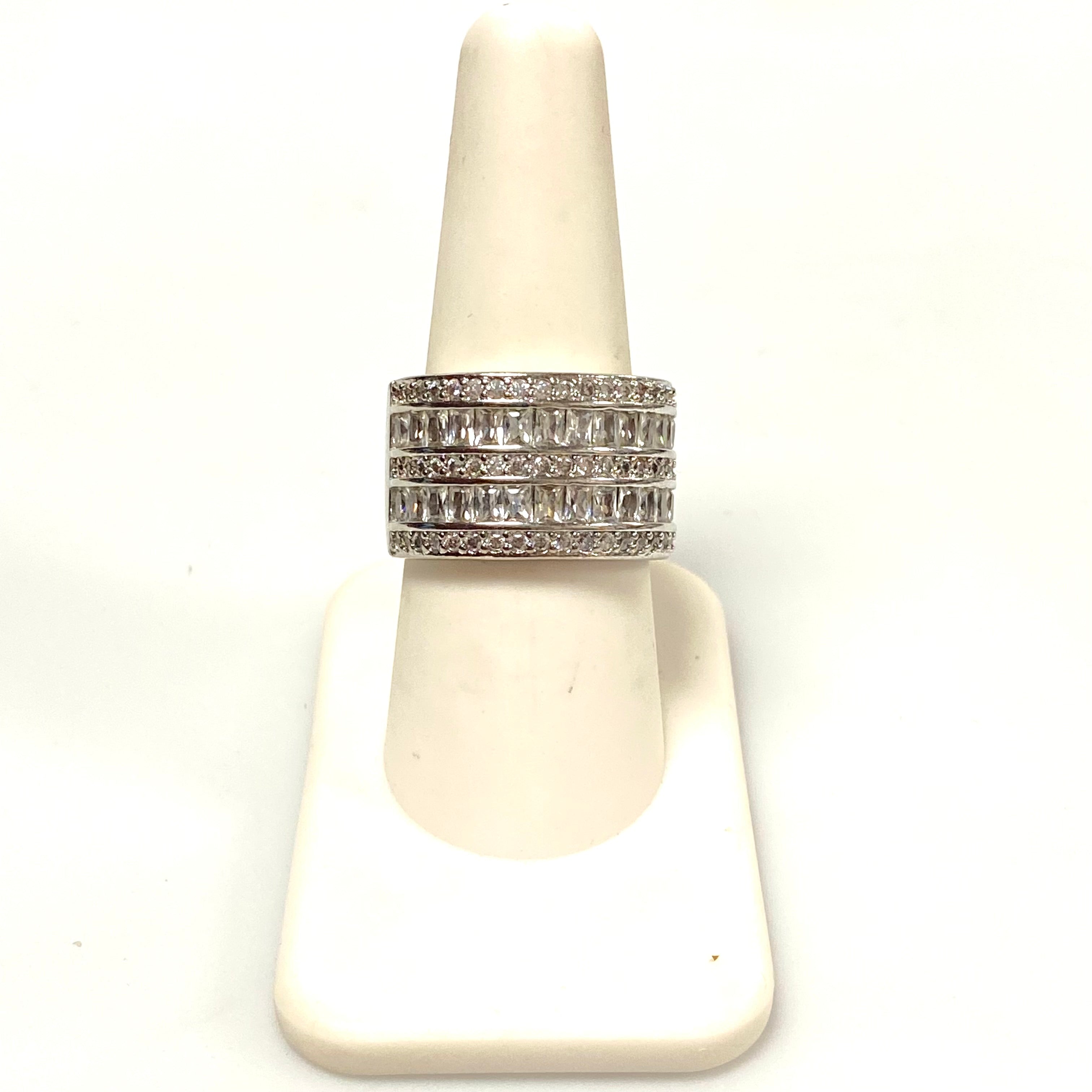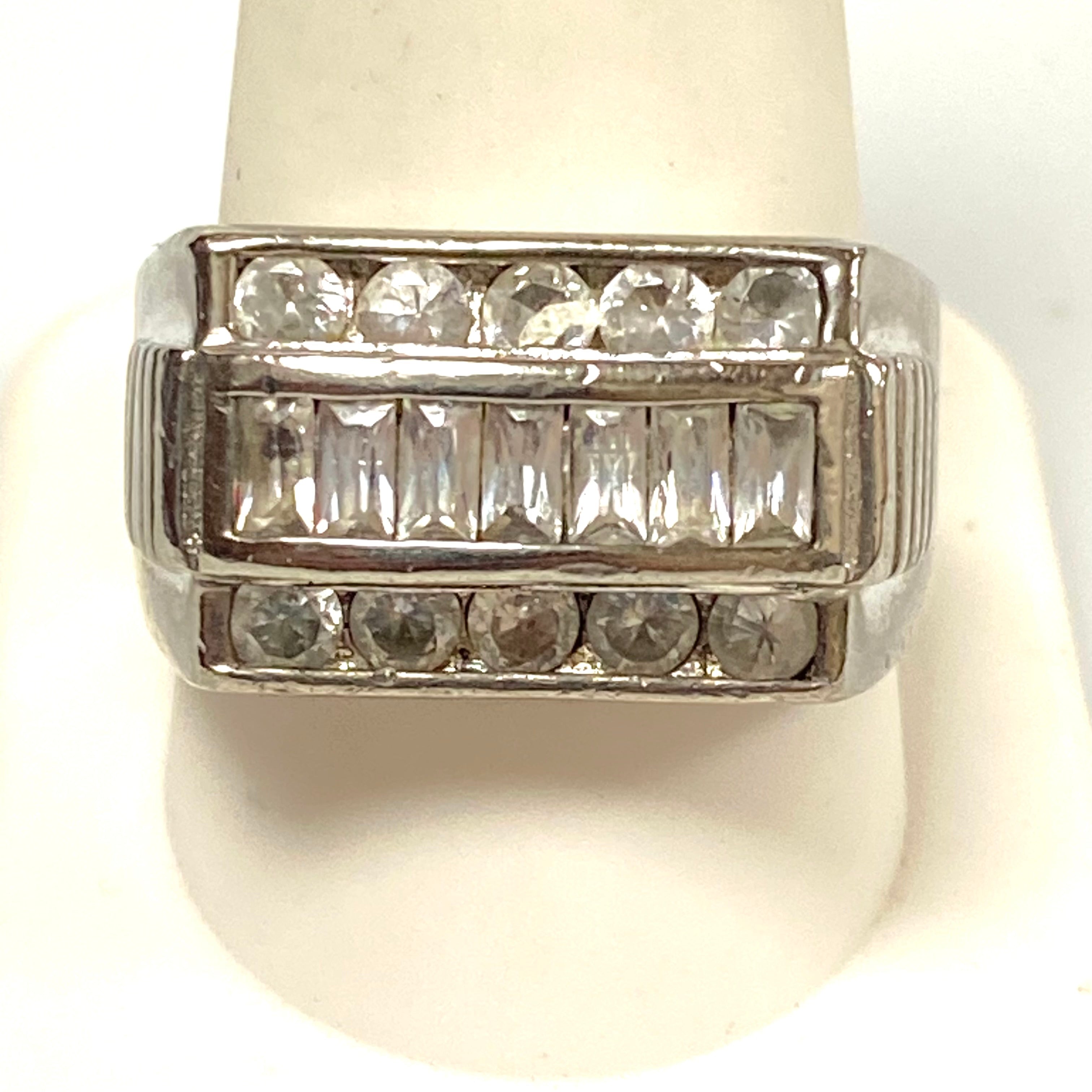 v590 Vintage Sterling Silver Baguette White Stone 12mm Wide Band Ring Size 11