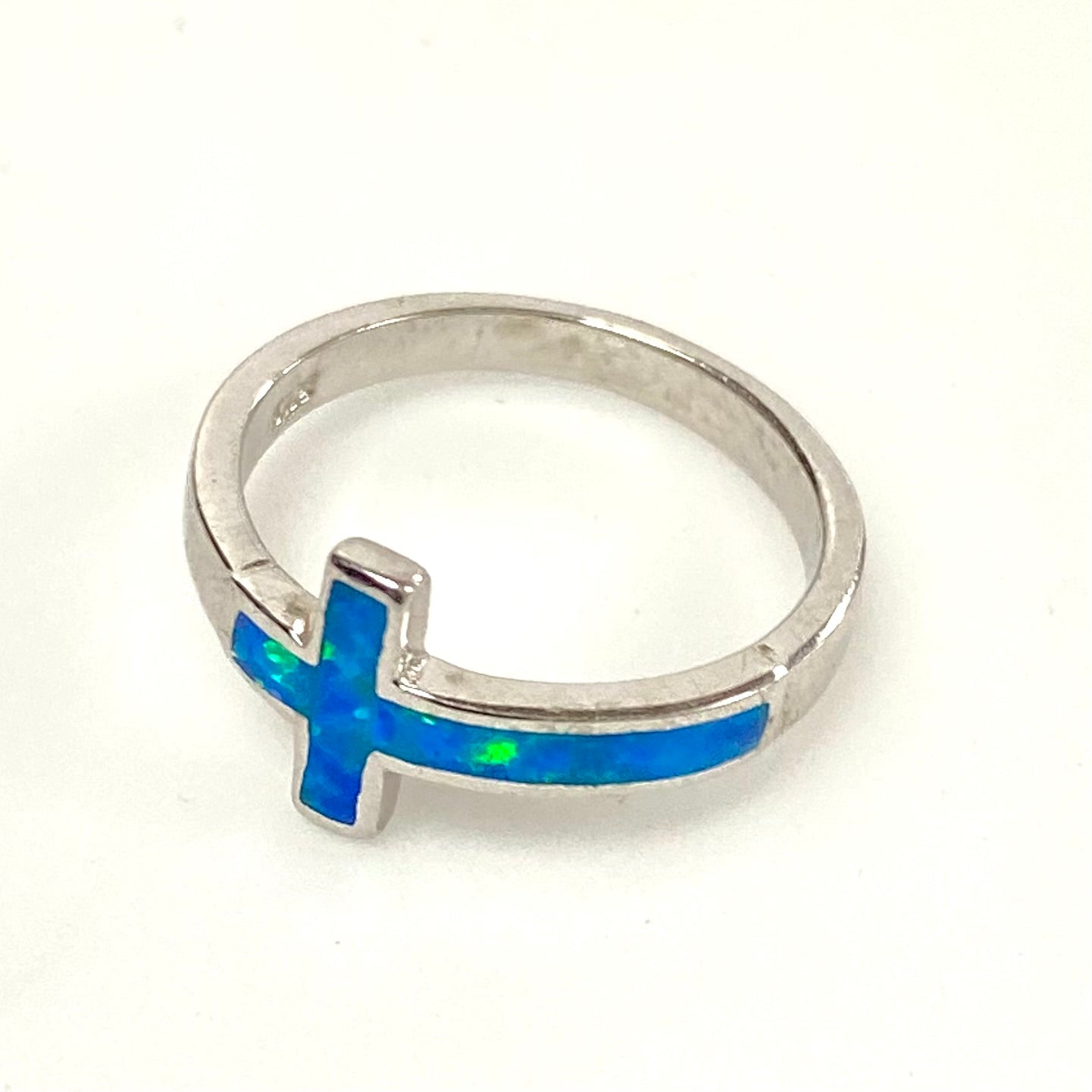 v594 Vintage Sterling Silver Blue Opalata Inlay Cross Band Ring Size 3.75