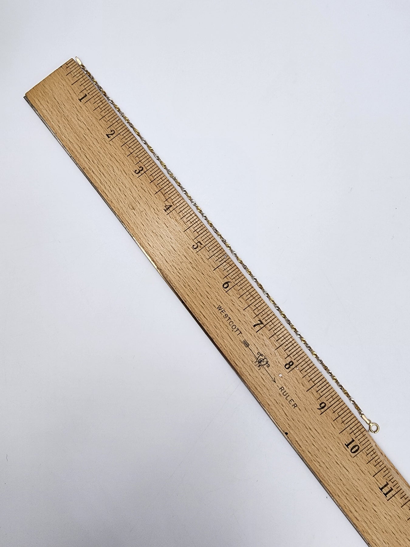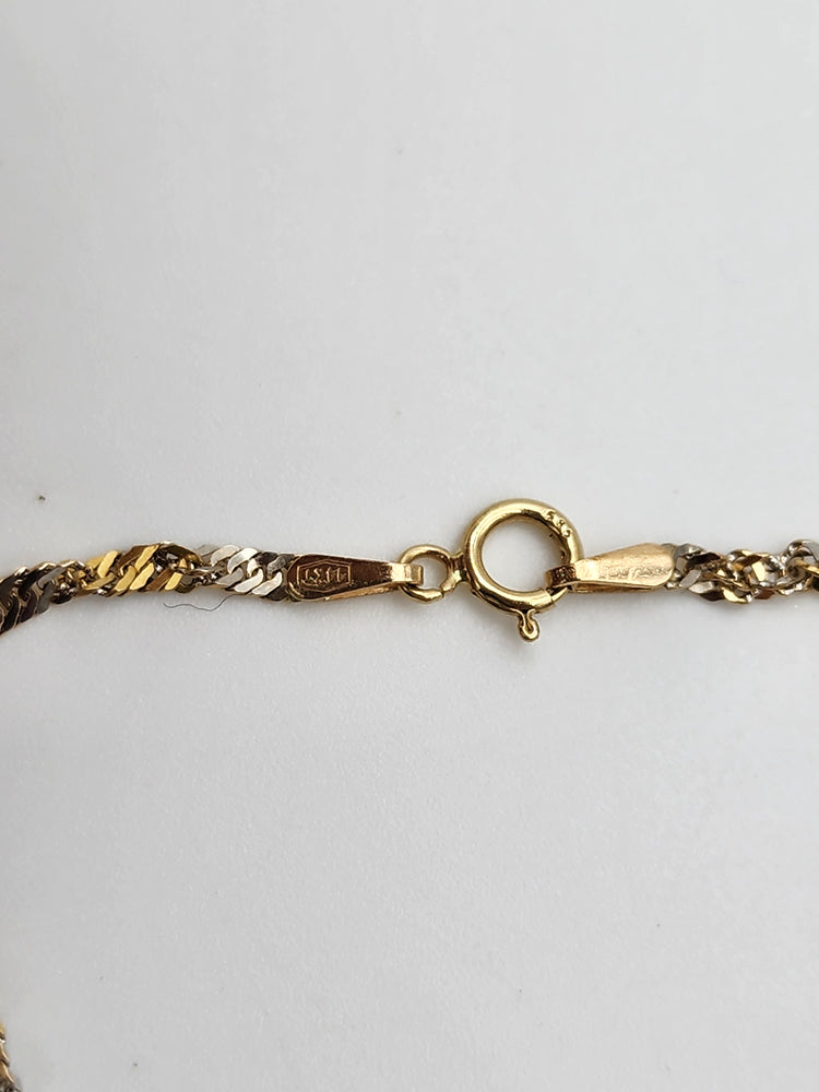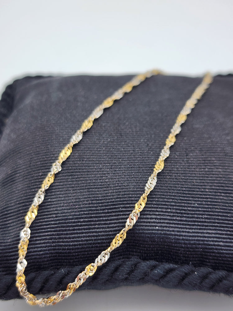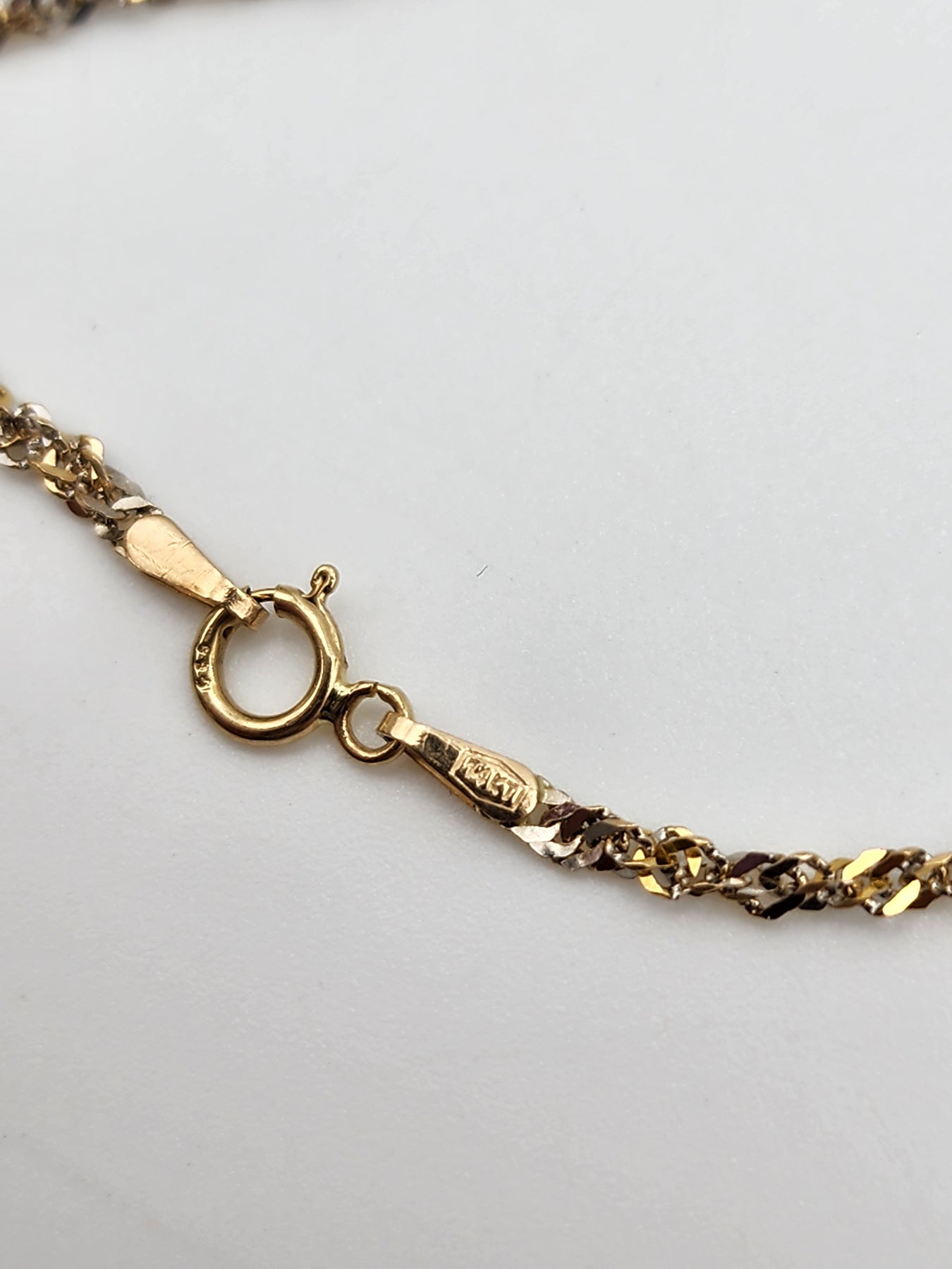 This is a lovely 14kt white and yellow gold Singapore anklet. It is in very good shape with no kinks. Perfect for daily wear. Anklet is stamped 14k. Would be a nice anniversary or birthday gift for her!