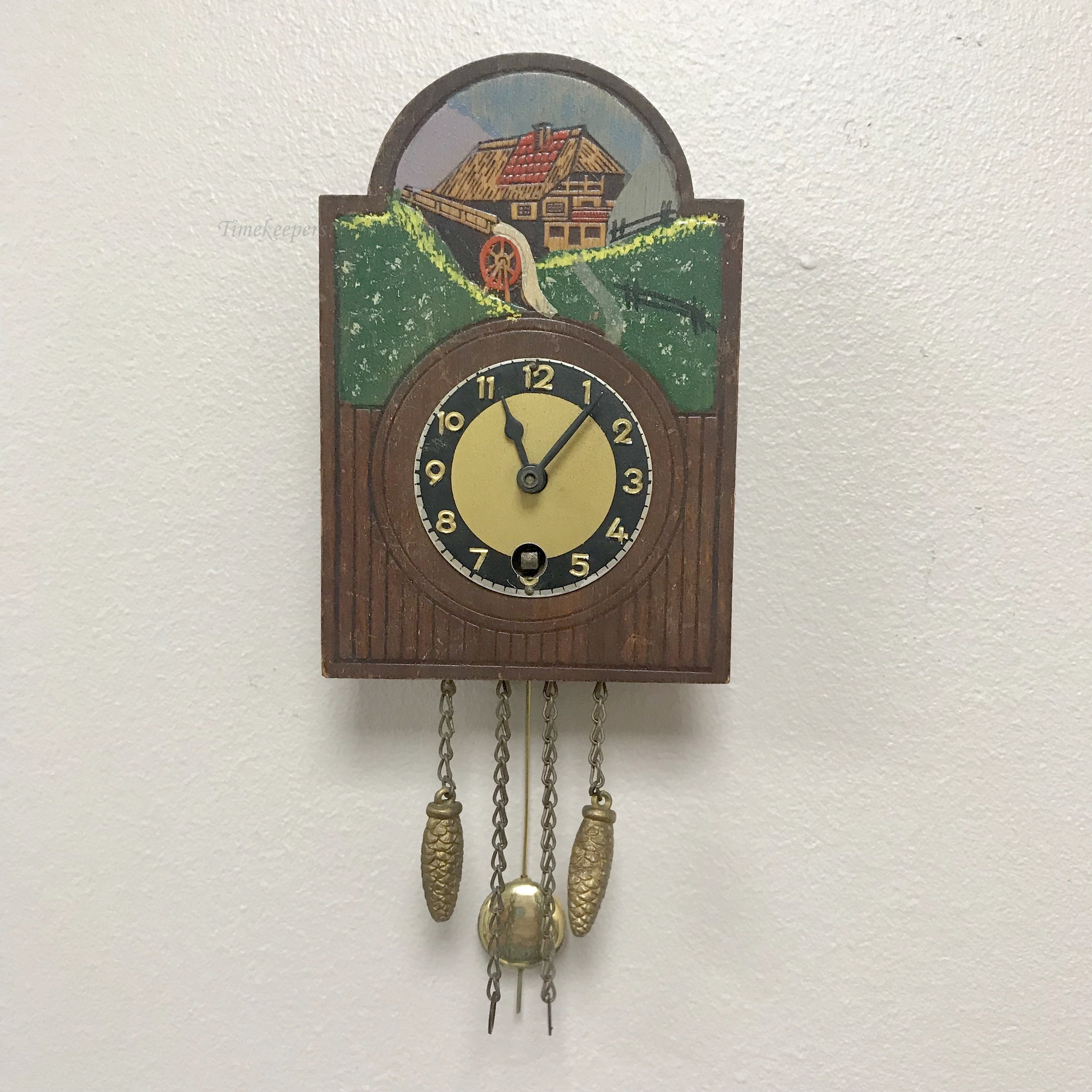 f389 Vintage German Animated Pendulette Miniature Wall Novelty Clock 1900's