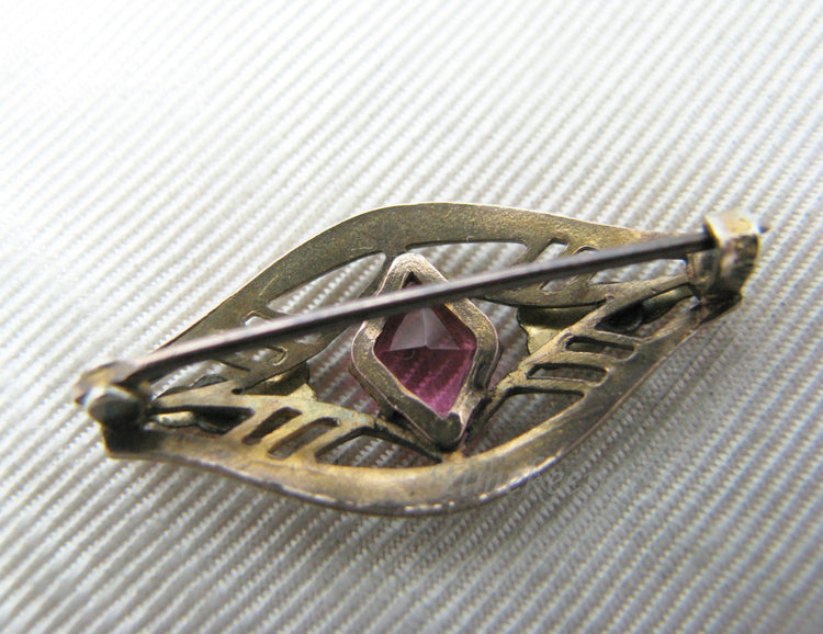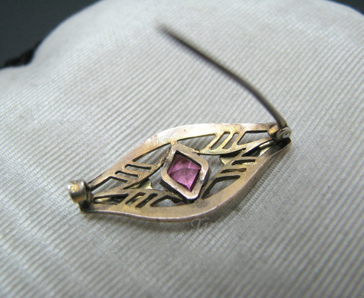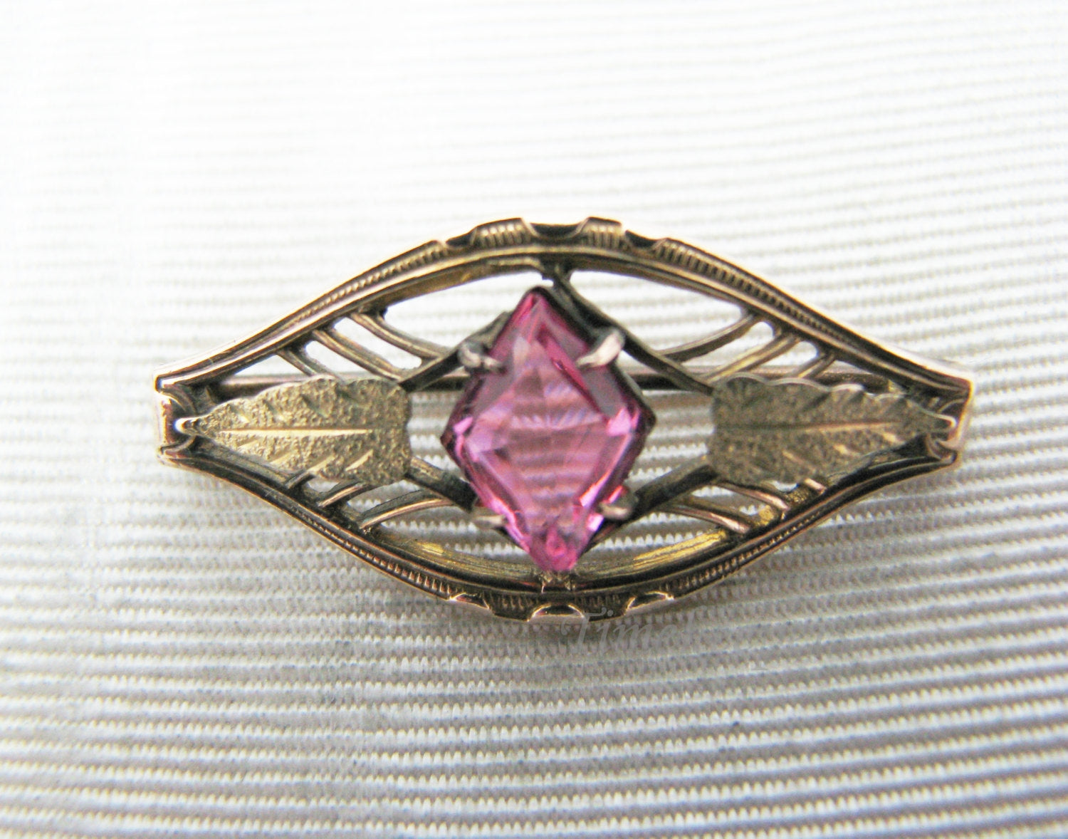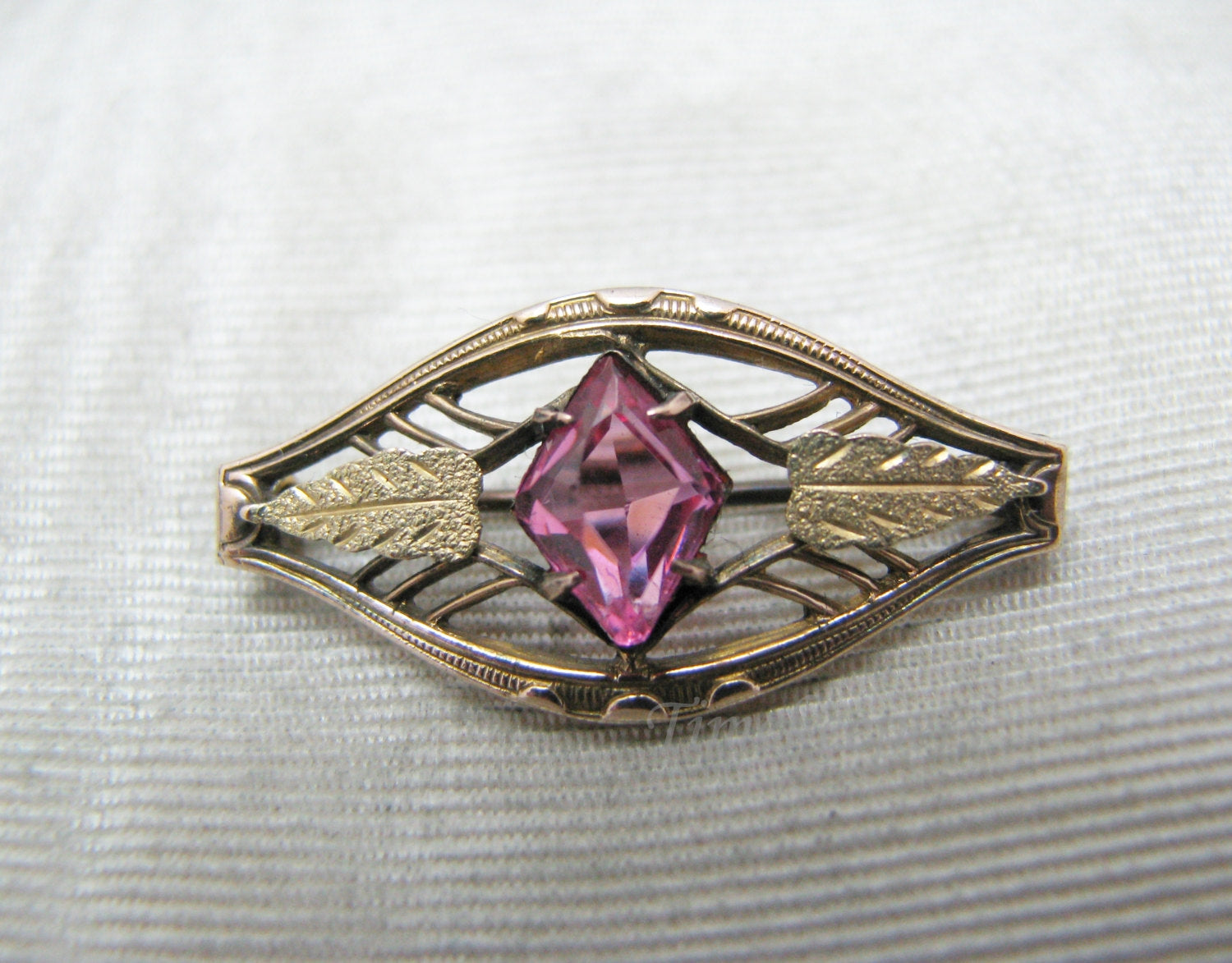 This is a very pretty gold filled brooch with a Diamond Shape pink stone. Lovely gold filled leaves adorn either side of the pink stone. This brooch is still in very nice condition.