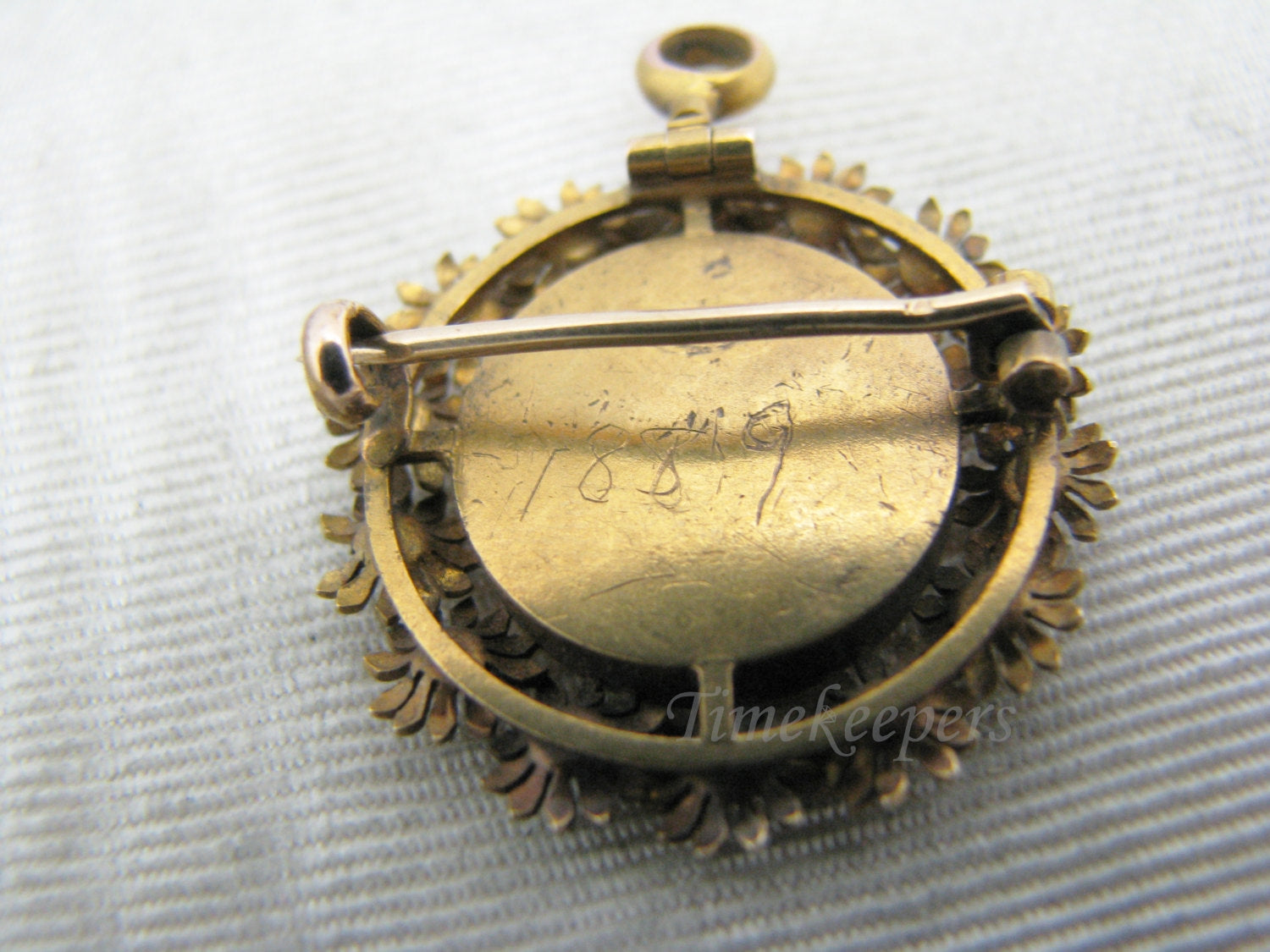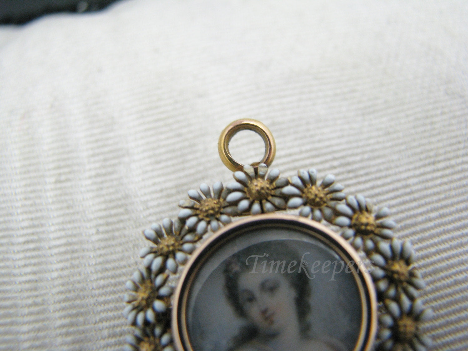 This is a beautiful brooch with a folding bail to wear as a pendant also. This brooch features a portrait of a lovely lady surrounded by a frame of enamel daisies. Someone scratched 1889 on the back of this brooch. We are not positive if that is the year it was made or a year special to someone. This is definitely an antique piece. this piece is not stamped but has been tested to 14k gold.