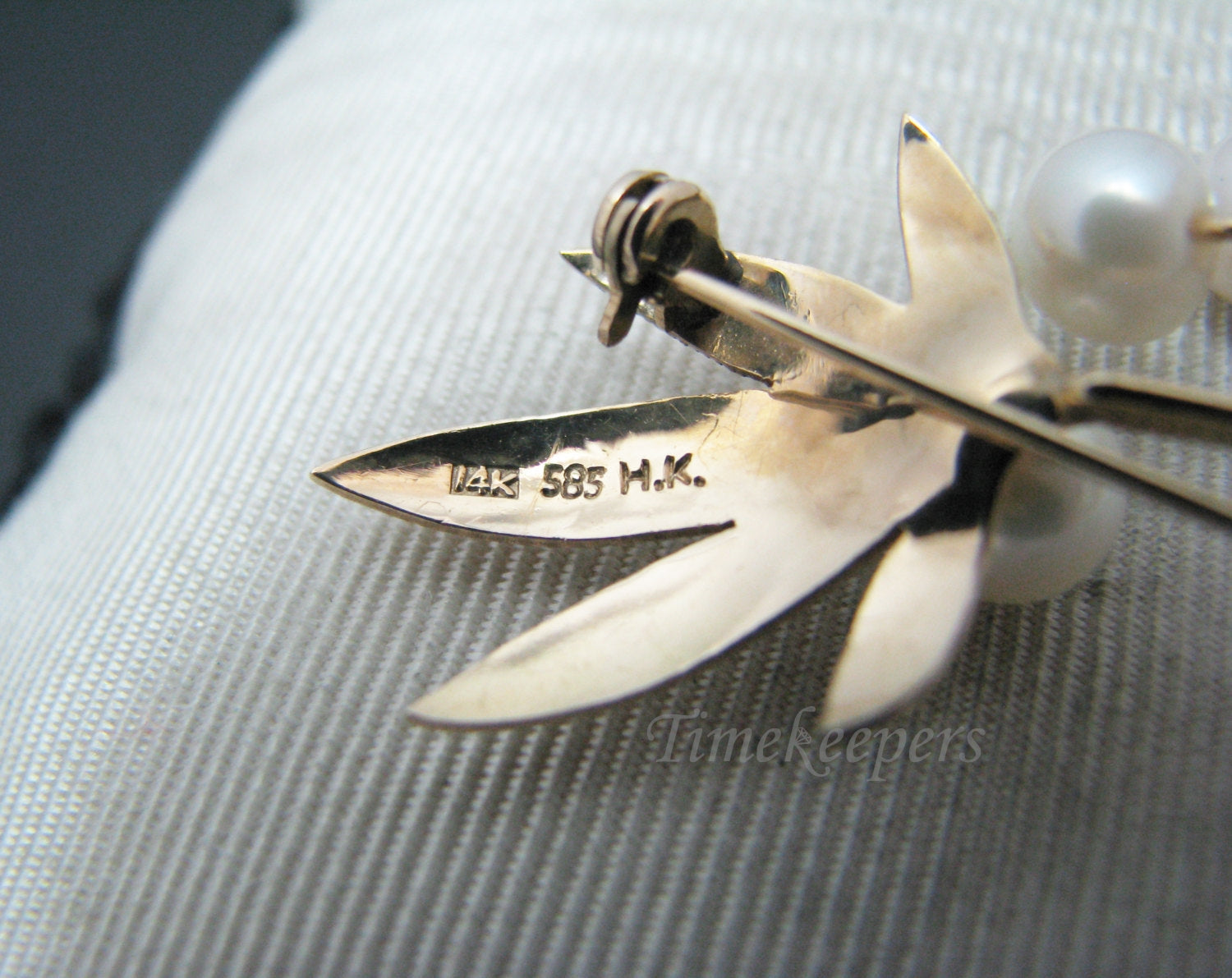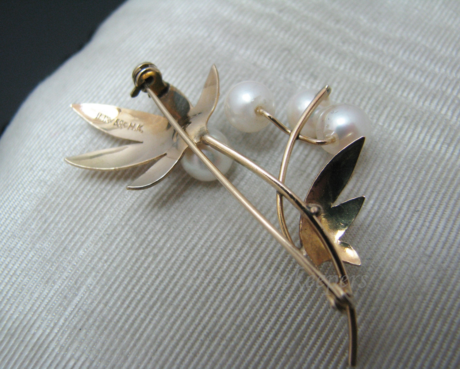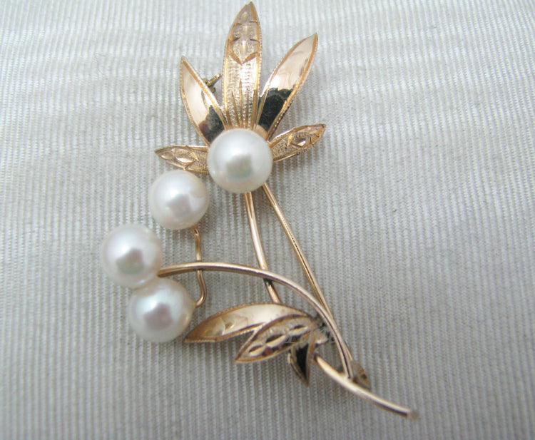 This is a beautiful brooch features a flower and stem design with (4) pearls all in 14k yellow gold. The back of the petal is stamped 14k.
