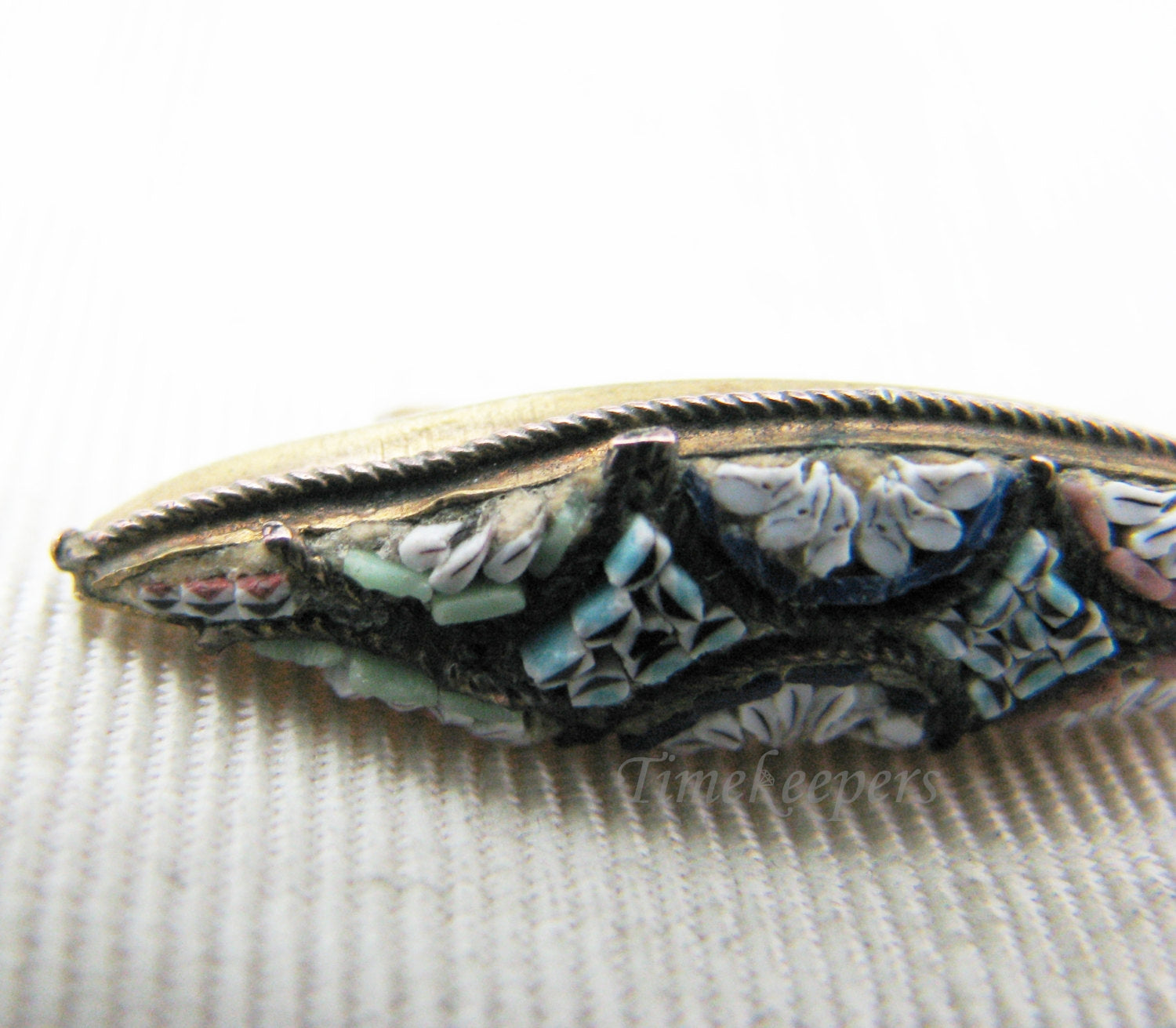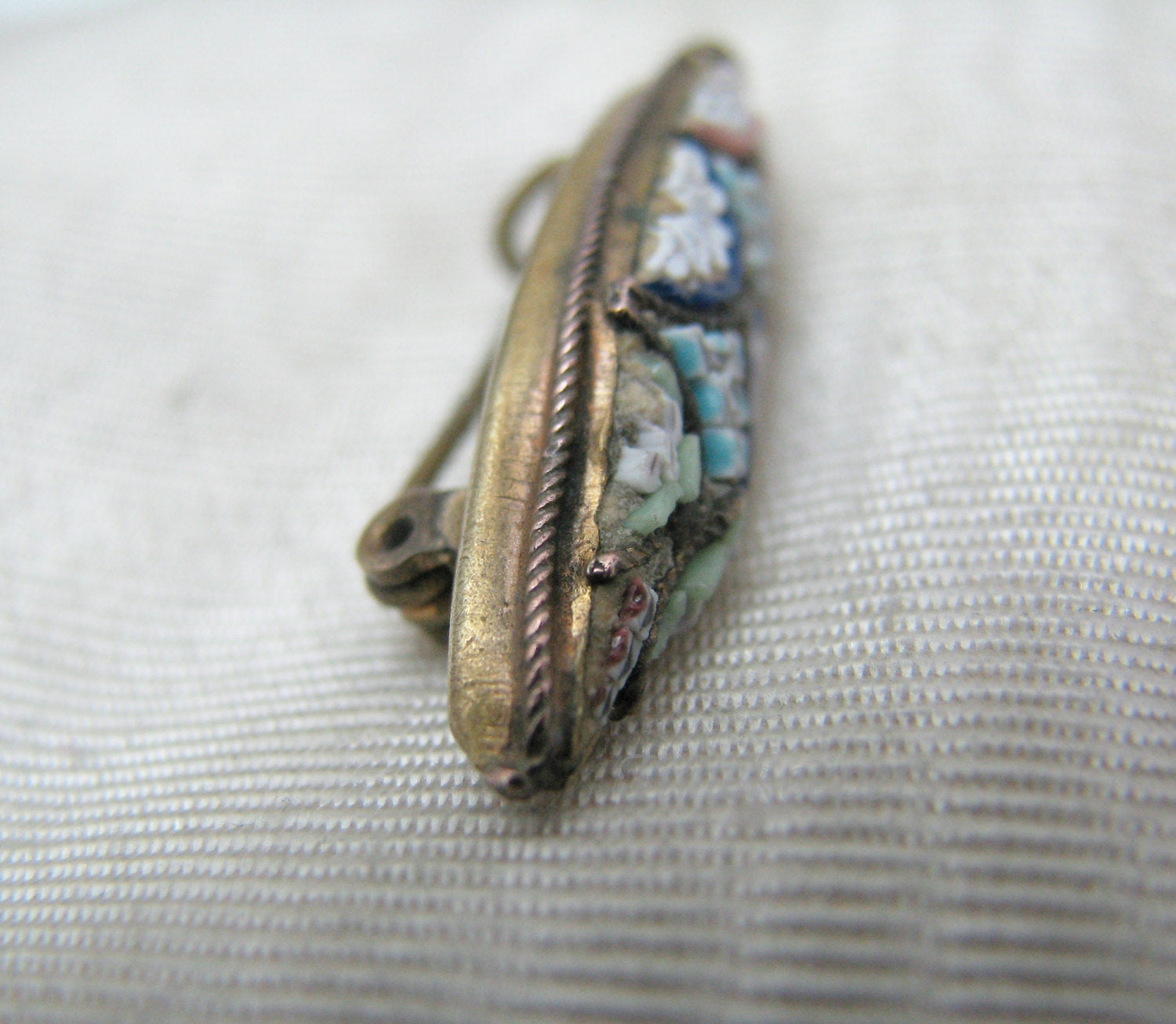 Micro Mosaic is composed of tiny pieces of glass carved and set by hand set in a brass back. These were sold as souvenirs for visitors for decades. This brooch is in good condition. This piece is not signed, although most likely from Italy.