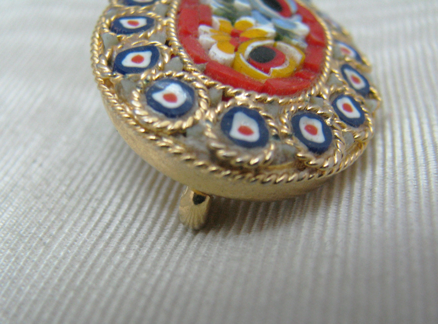 Micro Mosaic is composed of tiny pieces of glass carved and set by hand set in a brass back. These were sold as souvenirs for visitors for decades. This brooch is in good condition. The brooch features a flower center surrounded by a red background. This piece is not signed on the back but probably from Italy as most of these pieces are.