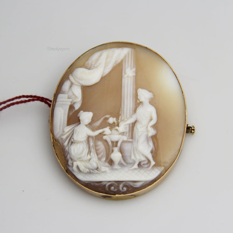 This cameo brooch is carved with a serene scene of women sharing tea. This brooch is not stamped, but has been tested for authenticity.
