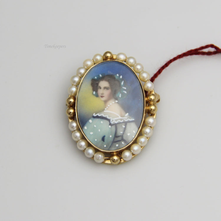 This brooch is painted with a portrait of a woman and decorated with pearls. This brooch is stamped.