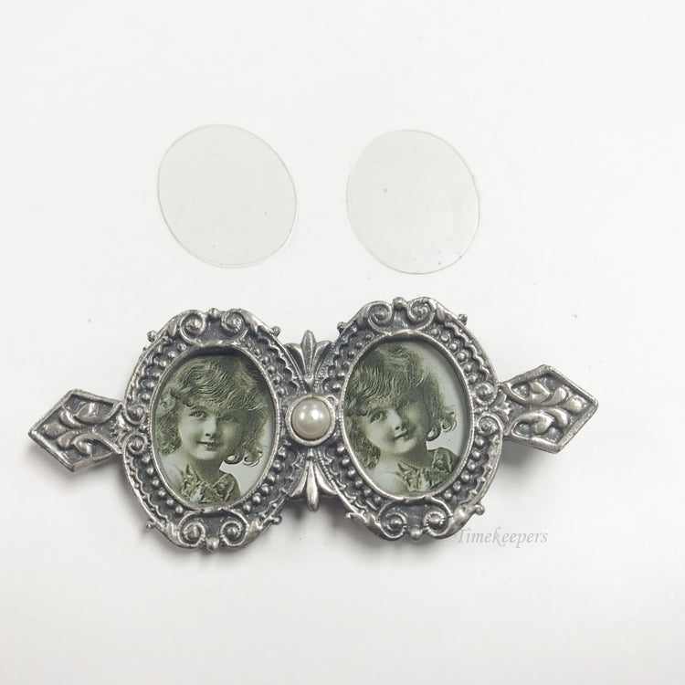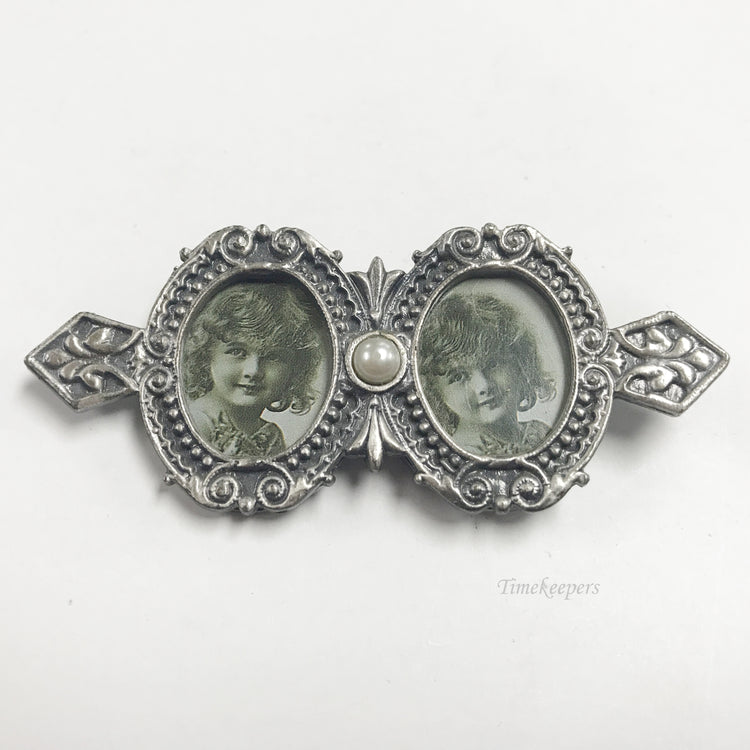 Vintage double picture Frame Silver Tone Brooch. Two oval frames connected in the middle. Decorated with round pearl color center stone.