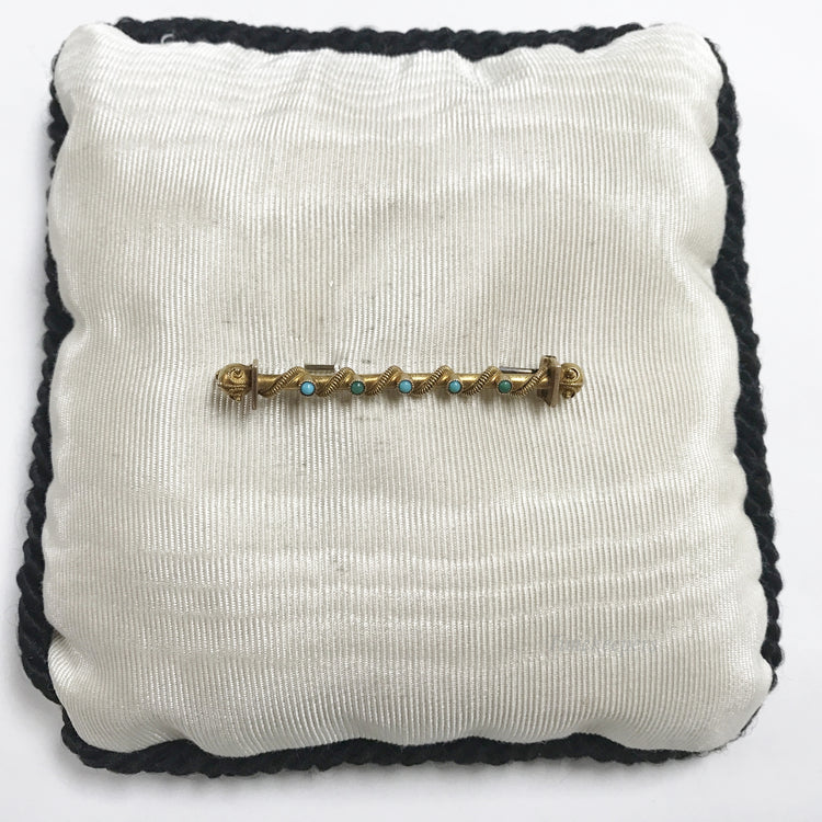 Vintage 14K(tested) Yellow Gold Pin Brooch. Five Blue Turquoise Stones (2mm in diameter each) on a Twister Wire Bar