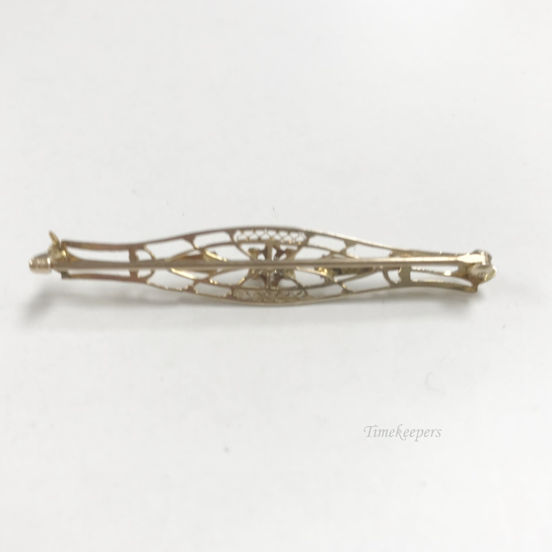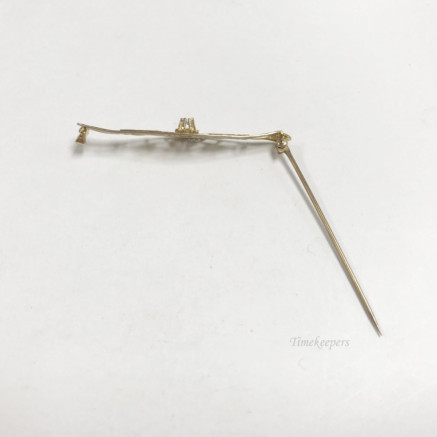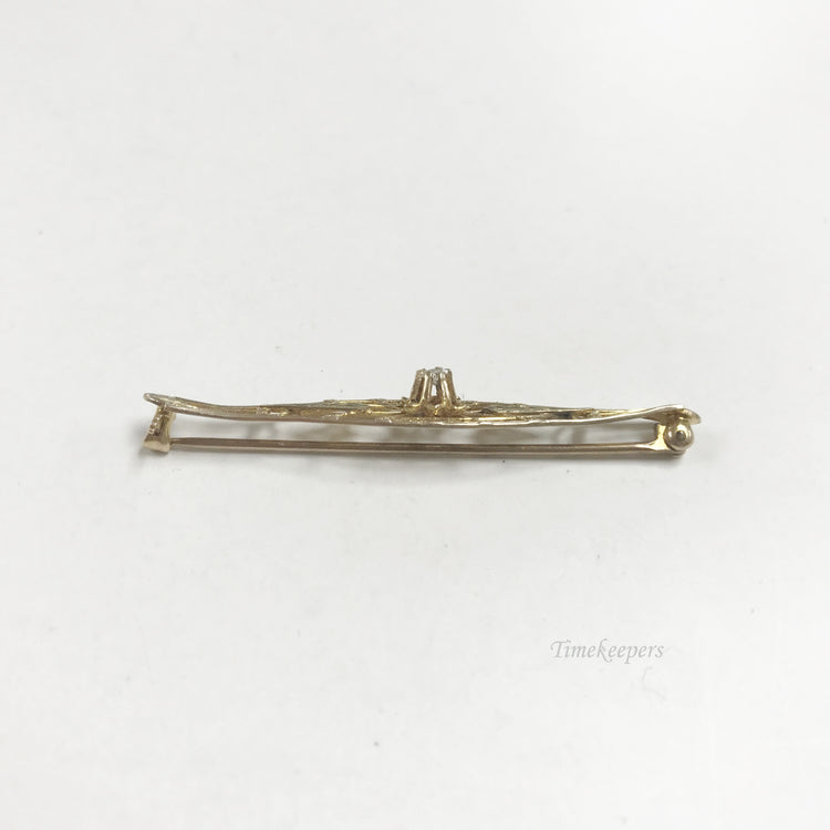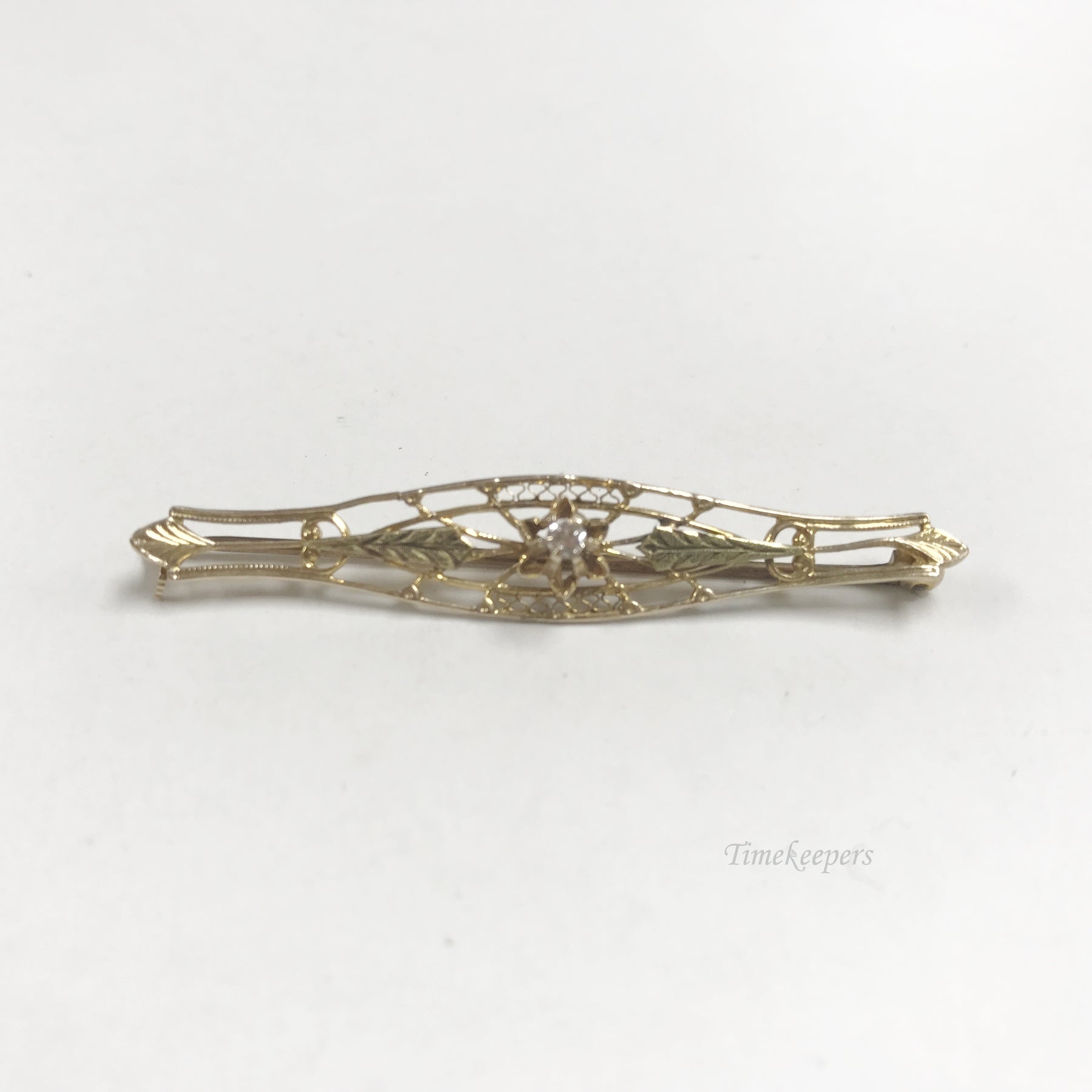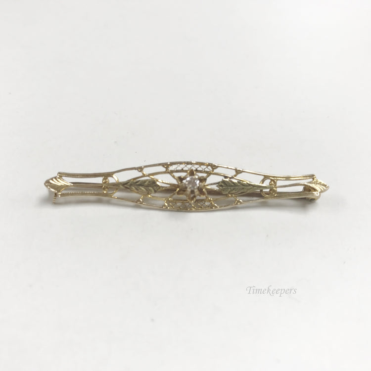 e803 Vintage Elegant 10K Yellow Gold White Diamond Filigree Pin Brooch