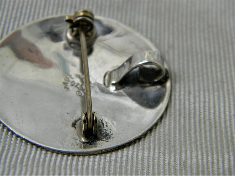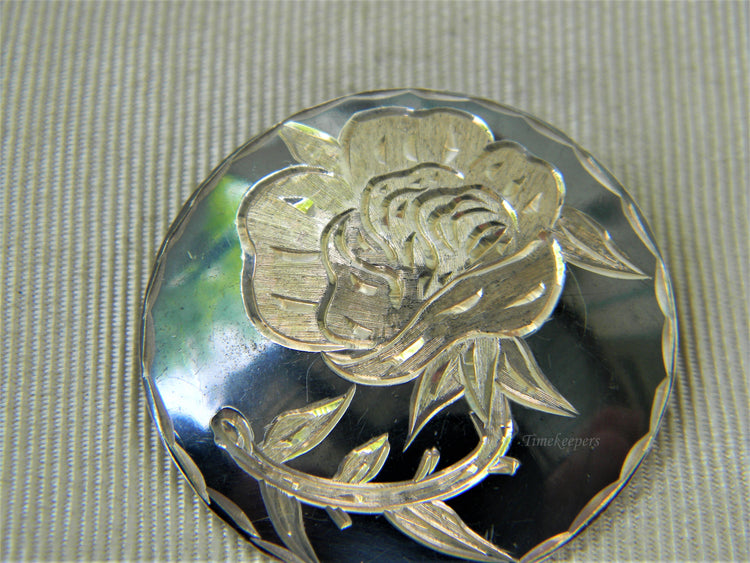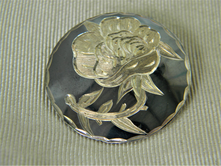 For Sale: (1) Vintage Sterling Niello Gray Enamel Round Flower Brooch/ Pendant PLEASE READ ENTIRE DESCRIPTION BEFORE PURCHASING This is a lovely vintage piece, the center features a carved rose. This is a design done in gray Niello enameling. The back is stamped Made in Mexico, 925. Please see pictures for more details! Specifics: Diameter approx. 1 1/4" Weight: 7.3 grams