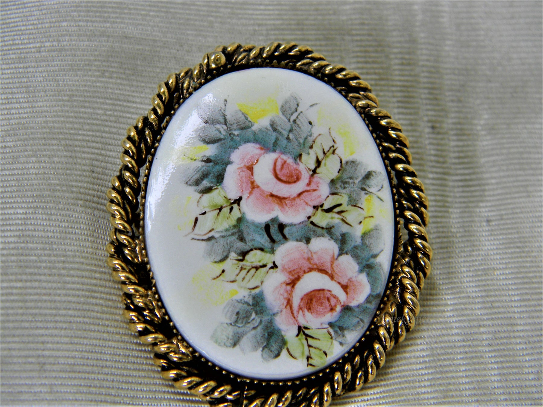 For Sale: Stunning Vintage Brooch with Painted Pink Flowers and Leaves in Gold Tone PLEASE READ ENTIRE DESCRIPTION BEFORE PURCHASING Please see pictures for more details! Pre-owned: Some scratches from normal wear. All vintage/antique items sold as is as shown on pictures. Stunning gold tone vintage brooch featuring a twisted rope frame around painted pink flowers with leaves. This is a convertible piece that can be worn as a brooch or necklace. Everything works as it should on this brooch. Brooch is approx. 1 1/2" x1 7/8" All weights, measurements and colors are approximate and may vary slightly from the listed dimensions or as seen in the image. All pictures are magnified to show the smallest of details. Please, refer to the item description for actual weight and size evaluation. ------------------------------------------------------------------------------------------------------------------------------------------------------------ Please be 100% sure of your purchase before buying, as we do not offer refunds. We are more than happy to provide any specific pictures, or answer any questions you have regarding our items.