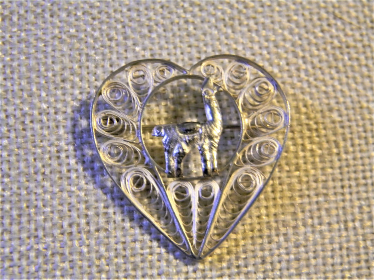 j484 Beautiful Unique Vintage 925 Silver Filigree Heart Brooch With Llama