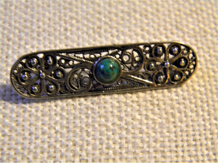j485 Beautiful Vintage 925 Silver Filigree Oval Brooch With Malachite