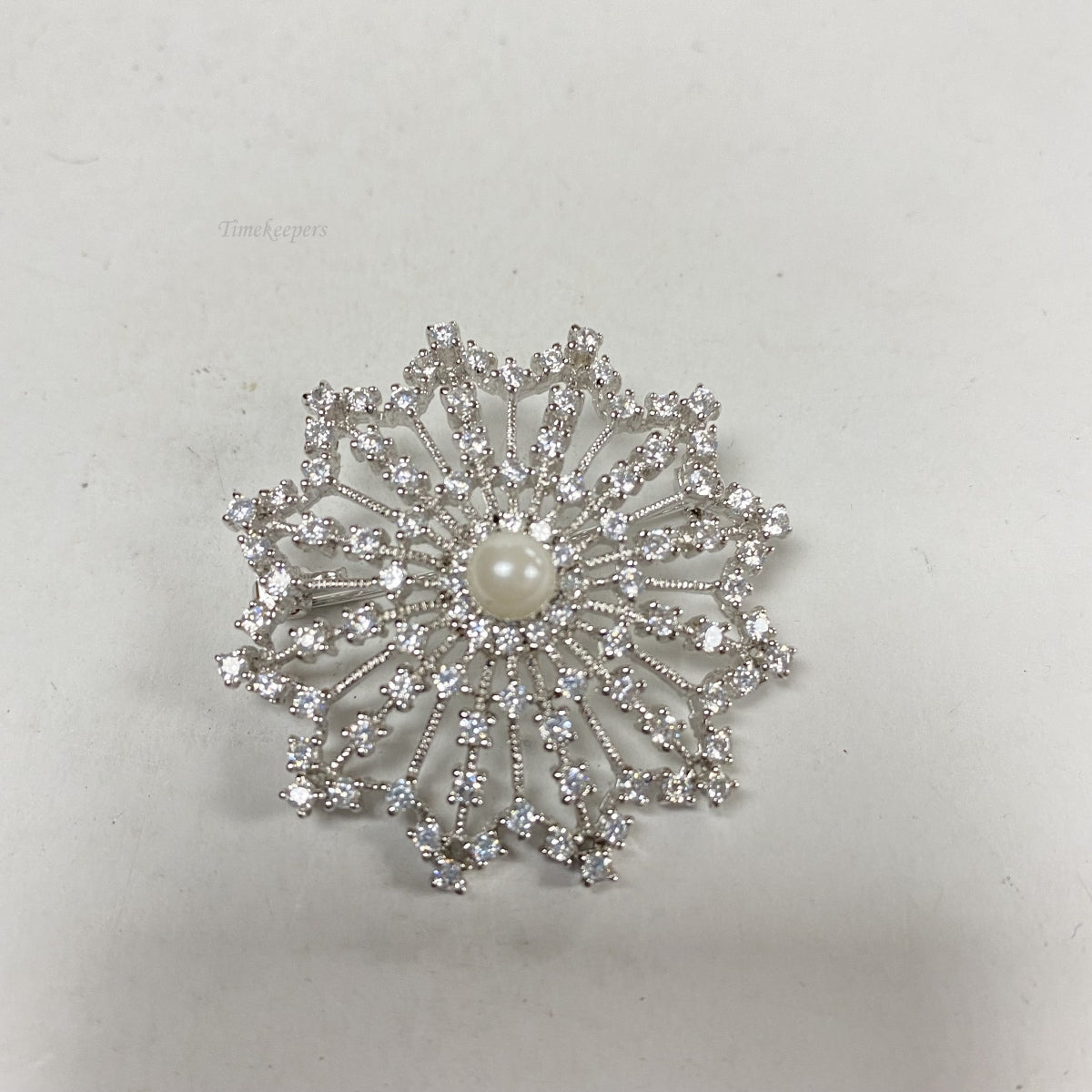 Vintage Sterling Silver Brooch Pin. stamped. decorated with clear stones 1/16" each and center pearl 3/16" in diameter.