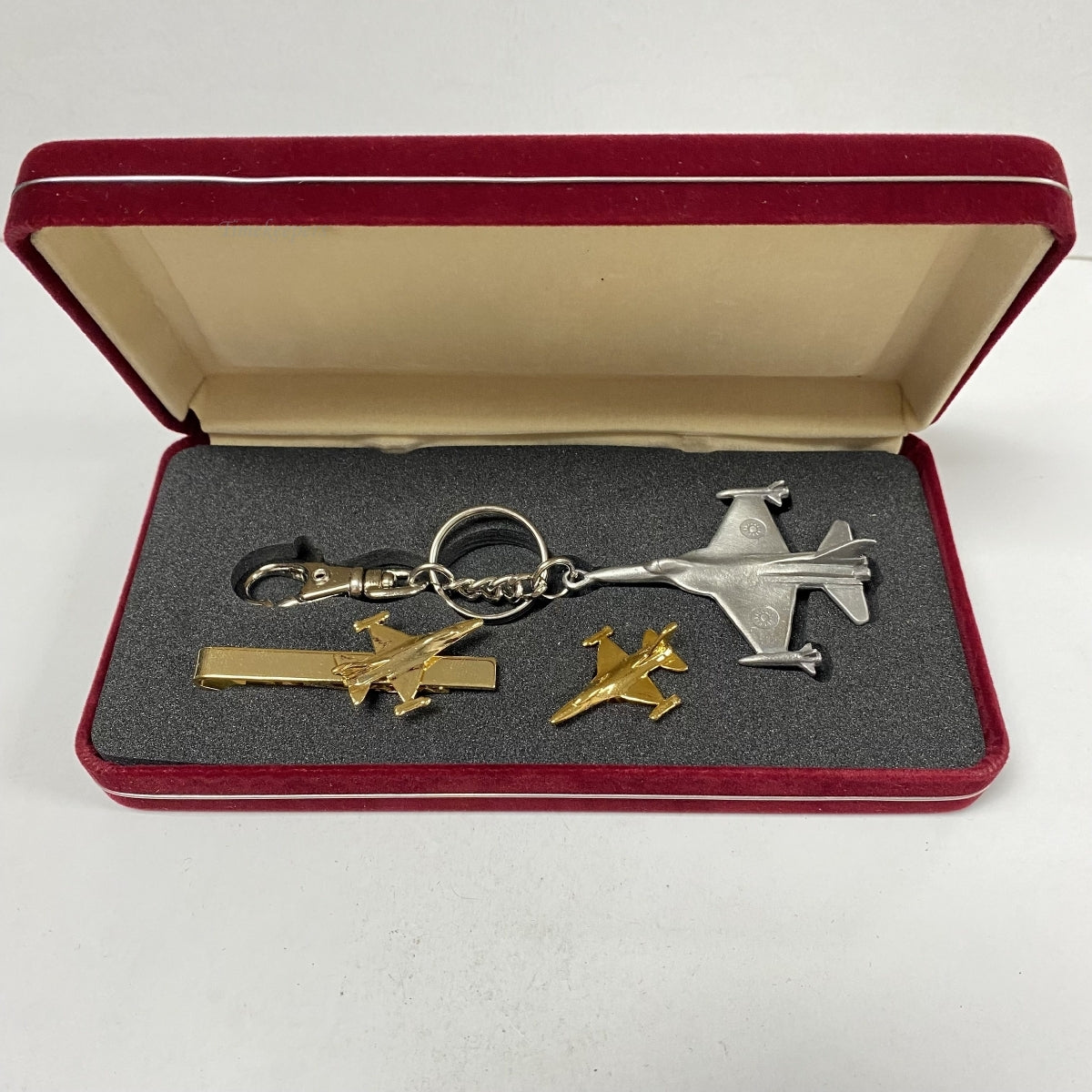 m318 Vintage Gold Silver Tone Airplane Lapel Pin Keychain and Tie Bar in Box