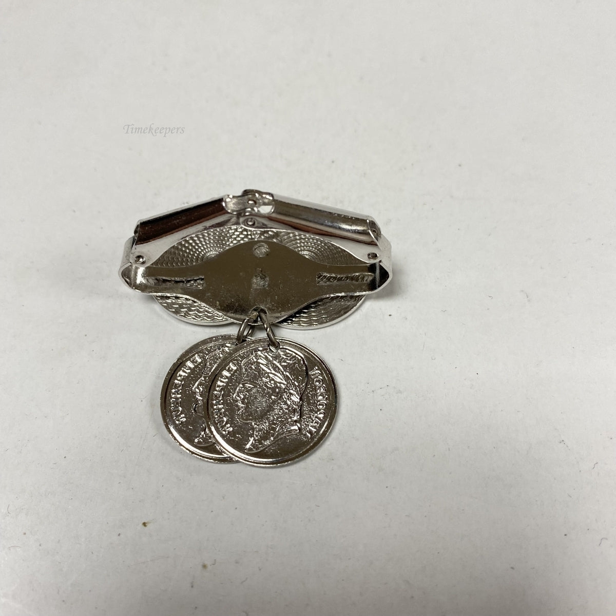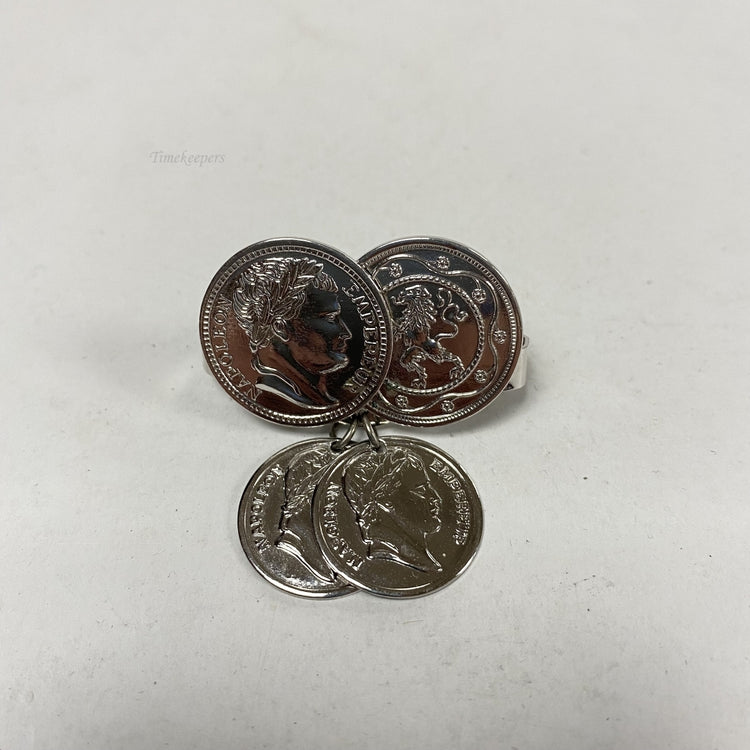 m319 Vintage "ROMAN COINS" Silver Tone Scarf Holder Clip Clasp