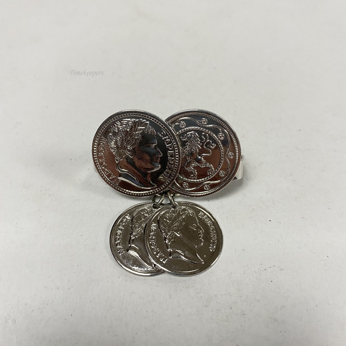 The scarf keeper consists of 2 large stationed coins(20mm in diameter) with 2 smaller coin(17mm in diameter) dangles.