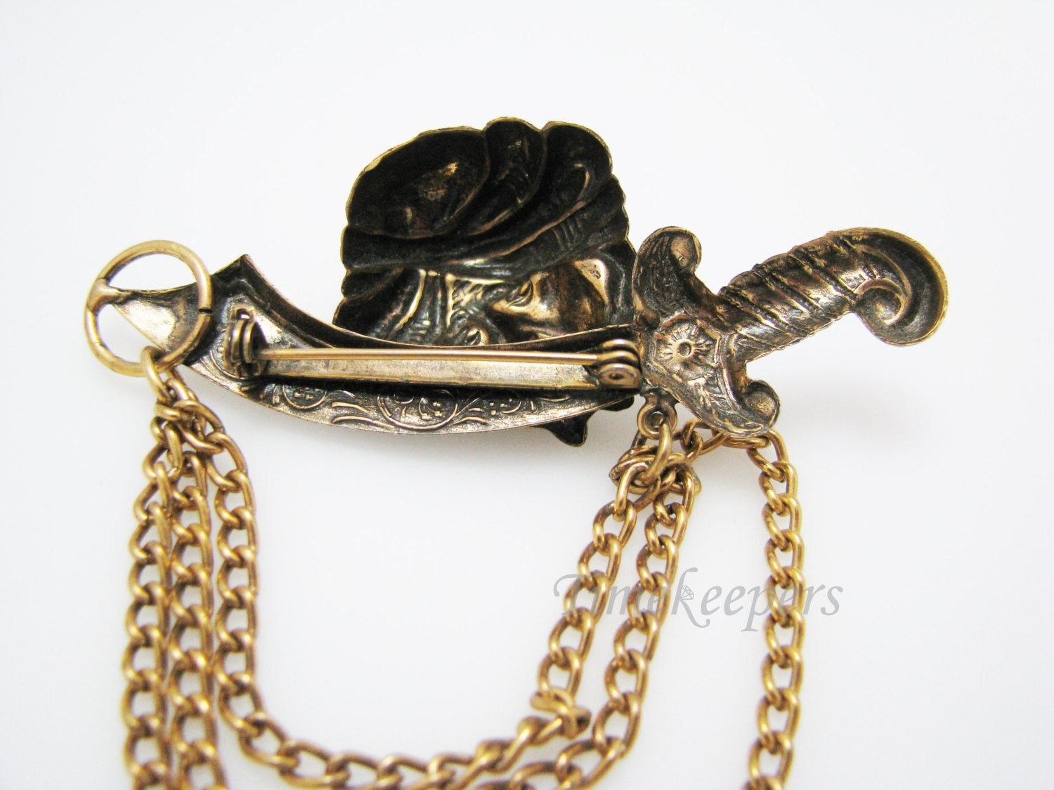 Very Nice Arabian sword and Warrior head with three chains brooch. This is a nice costume jewelry piece.