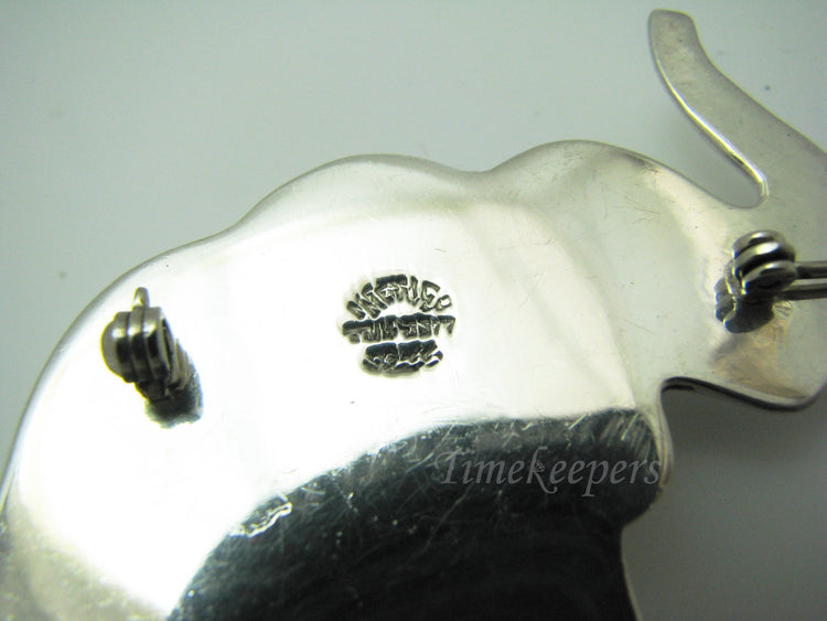 This is a cute elephant brooch made of sterling silver from Mexico. This brooch is stamped on the back Sterling, Mexico and another marking I can't make out. The clasp is a roll over clasp.