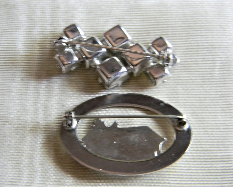 p328 Pair of Vintage Brooches, Rhinestone and Covered Bridge in Silver Tone