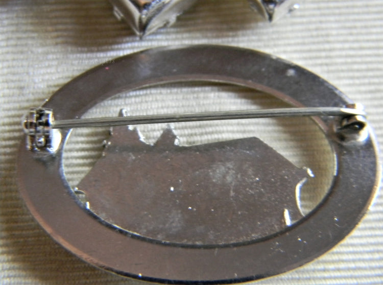 This is a pair of beautiful vintage brooches. The first brooch is a rhinestone brooch in silver tone. The second brooch is an embossed covered bridge brooch in silver tone. Neither brooch has any markings.