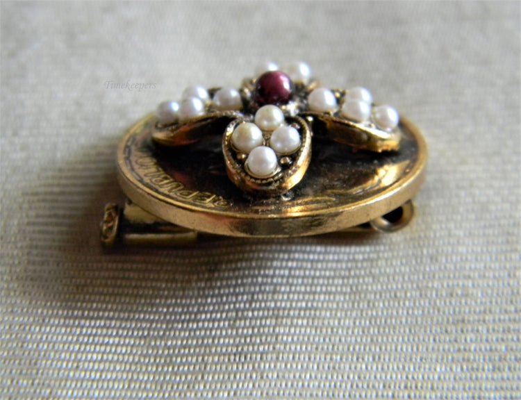 This is a unique gold filled brooch with a flower covered in faux pearls with a red stone in the center.