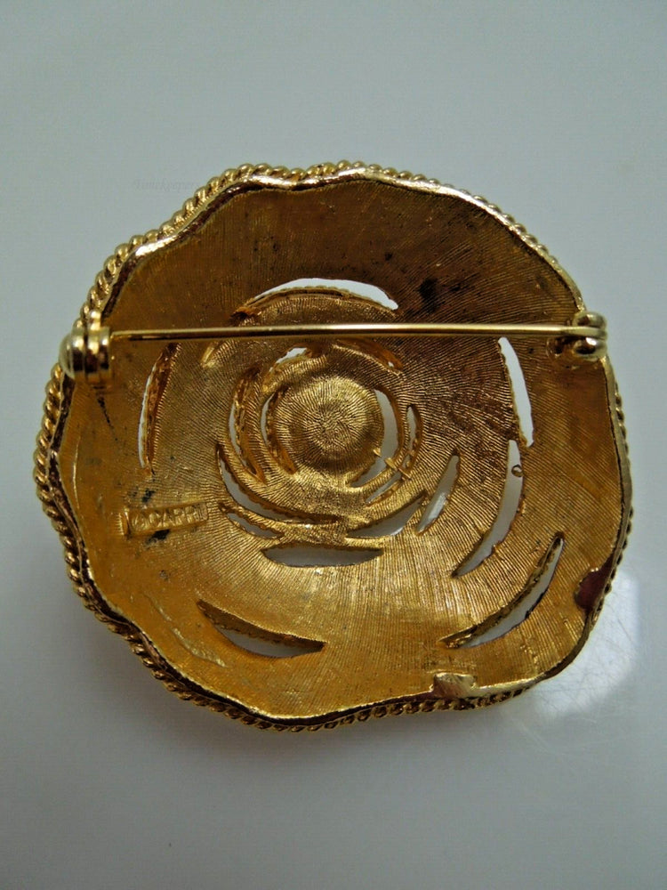 s634 Capri Gold Tone Brooch Pin and Clip-on Earrings Swirl Circle Faux Pearl Metal