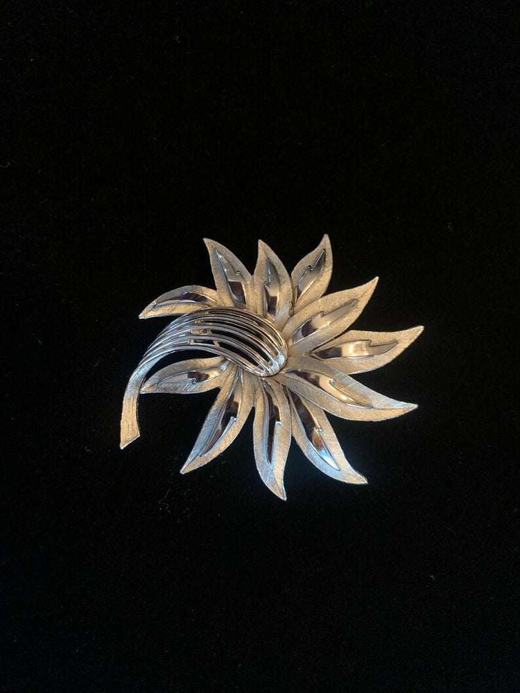 For Sale: (1) t574 Crown Trifari vintage signed and incredible shiny silver flower brooch with polished and textured silver