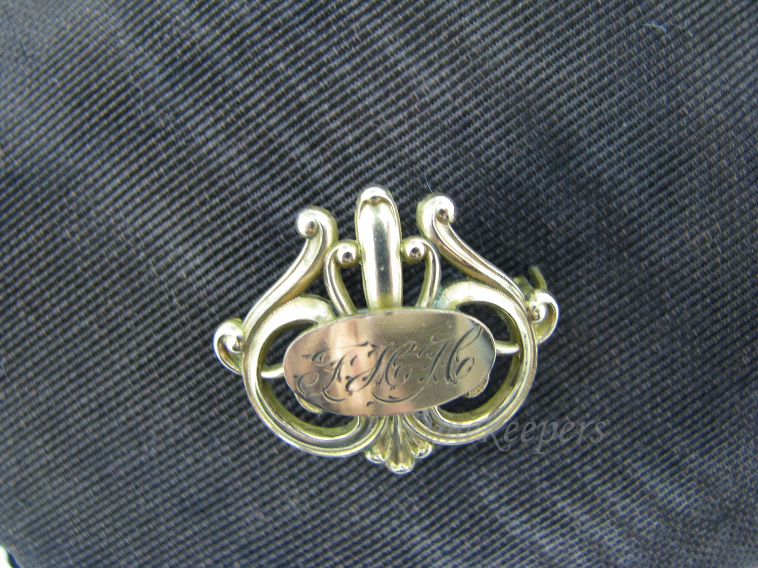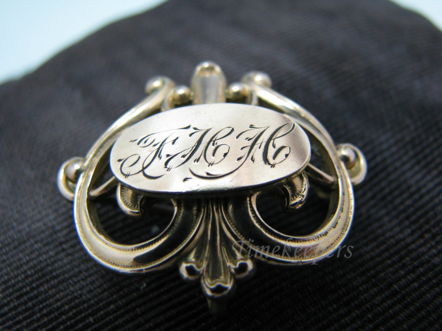 This is a vintage filigree lapel watch pin. It is stamped G.F. The front has a medallion that has the initials FHH engraved on it. This piece is 1 3/16" wide by 1" tall.