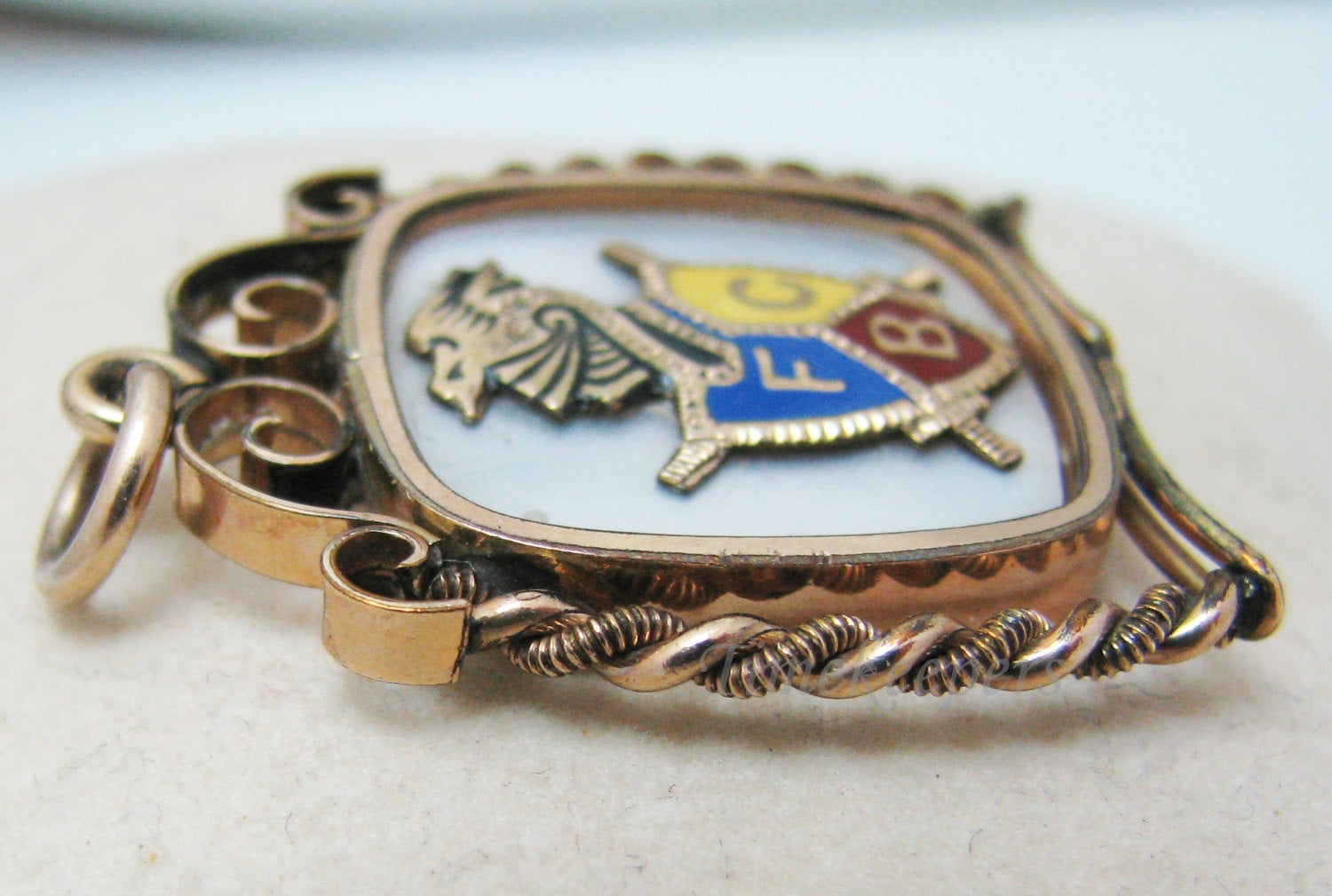 Knights of Pythias charm with what seems to be a mother of pearl background featuring an enameled shield with the FCB logo. The sides have a twisted rope pattern with a filigree top. The back has an etching of what looks like a moose.