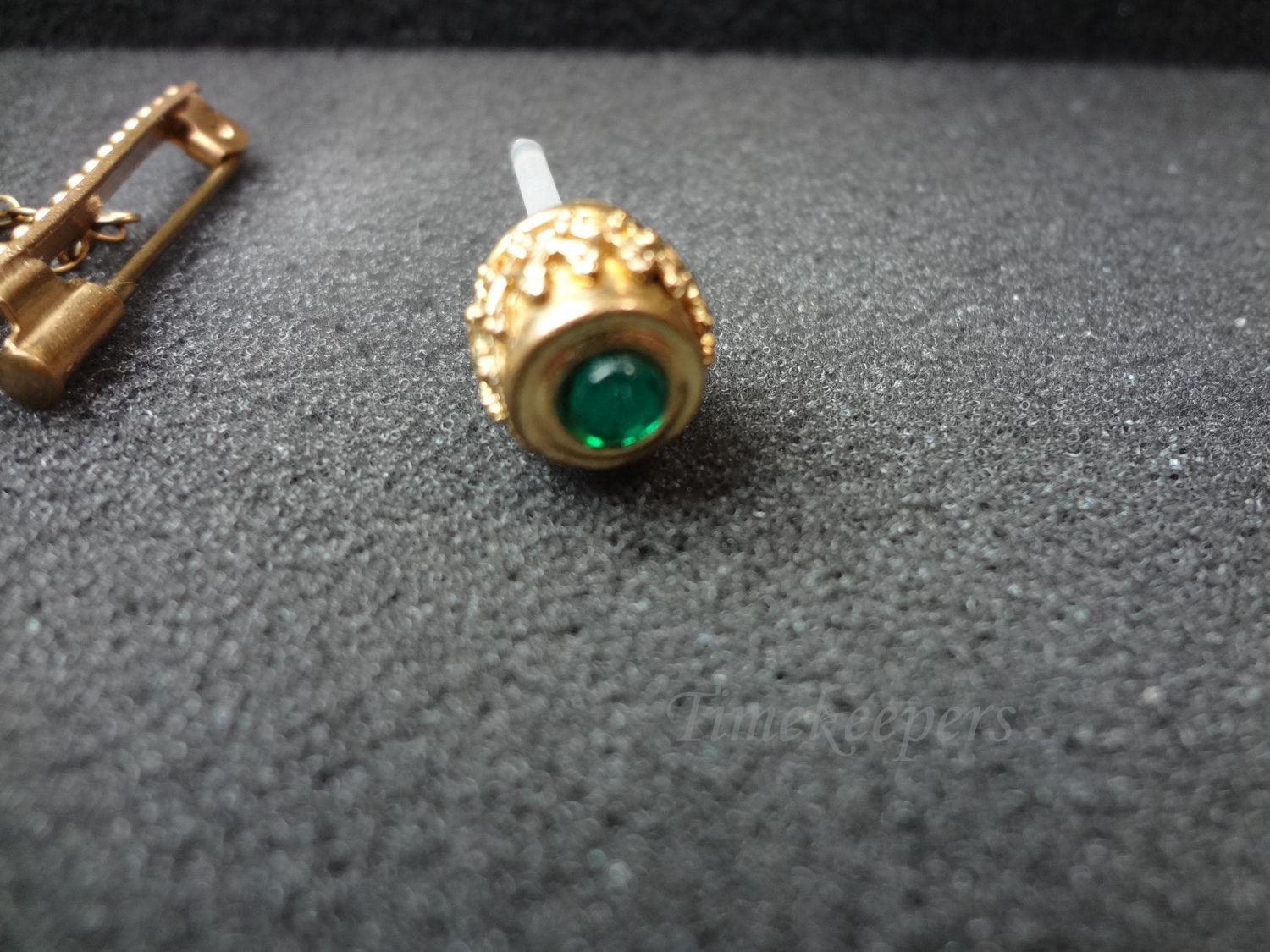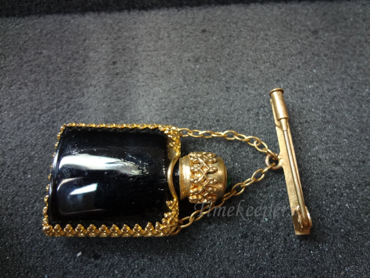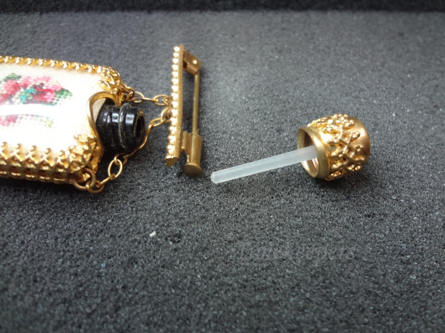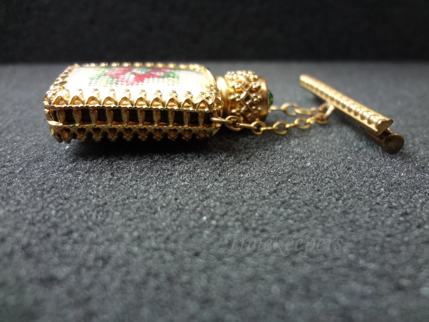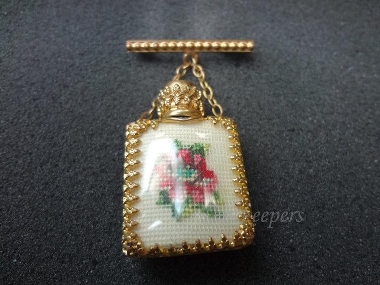 This is a lovely piece. The front of the bottle looks like a miniature cross stitch. The back of the bottle is black enamel. The top and sides are all a gold filled filigree. This all hangs from a gold filled chain and a gold filled bar brooch.